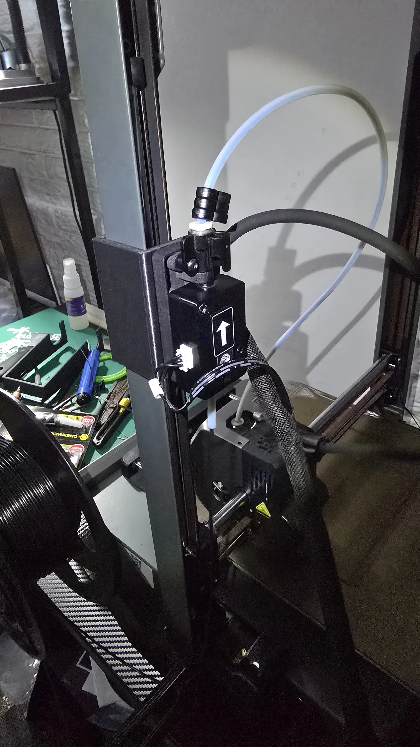 Bạn vẫn cần dùng “phần zin” để gắn sensor lên đầu nozzle của máy. Phần zin này sẽ nối với phần custom mình làm. Còn phần custom mình làm thì bạn chỉ cần “gắn” vào cột (column) của máy. Nó bám bằng “lực ép/nhấn” vì mình không muốn khoan lỗ lên cột máy, nhưng mình khuyên nên thêm một ít silicone để bám chắc hơn (mình dùng silicone lỏng trong suốt loại thường).