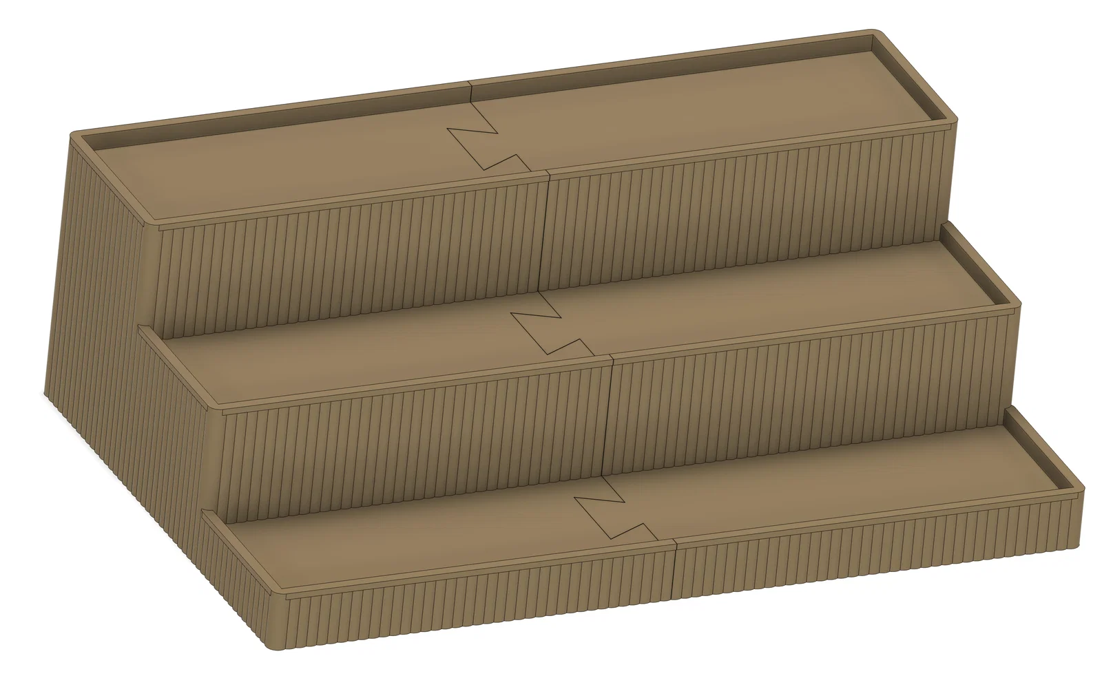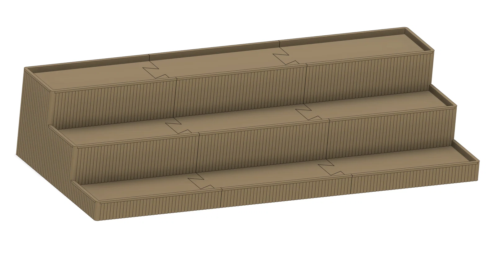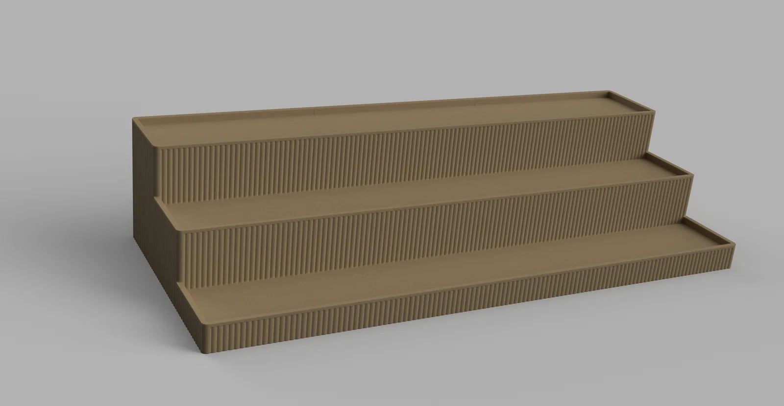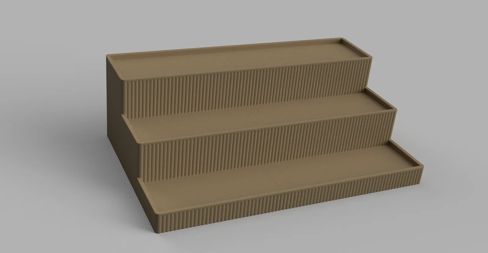 Kệ trưng bày lớn với 3 tầng. Mình in bằng Bambu PLA màu bronze nên nhìn rất sang. In thành 2 phần vì kích thước khoảng 15"x10".