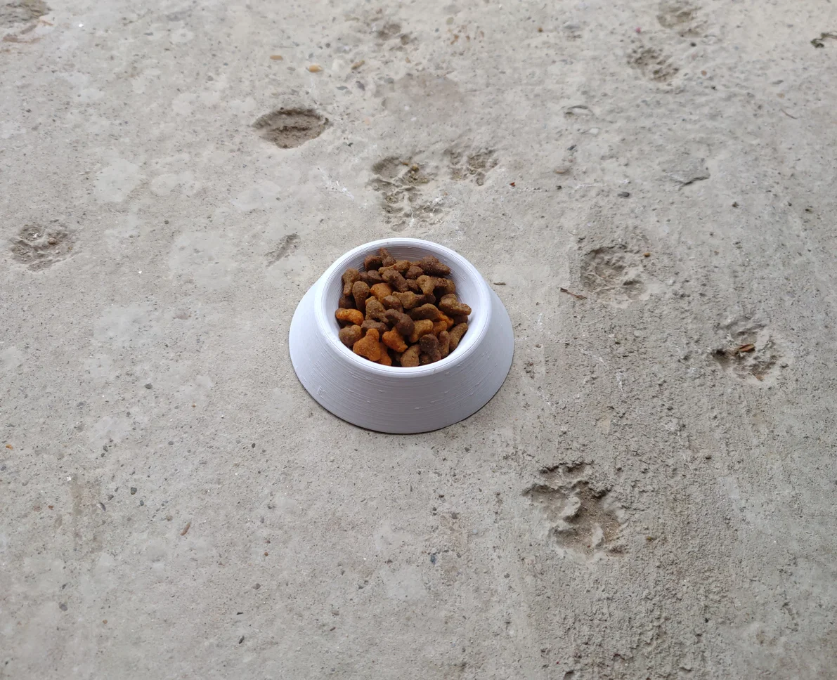Mẫu chén cho mèo thiết kế đơn giản, đường kính khoảng 100mm. Có thể scale lên tuỳ nhu cầu. Gợi ý in: layer height 0.3mm, nozzle 0.6mm, 3 perimeters, không cần supports; mình thử in PLA để theo dõi độ bền ngoài trời.