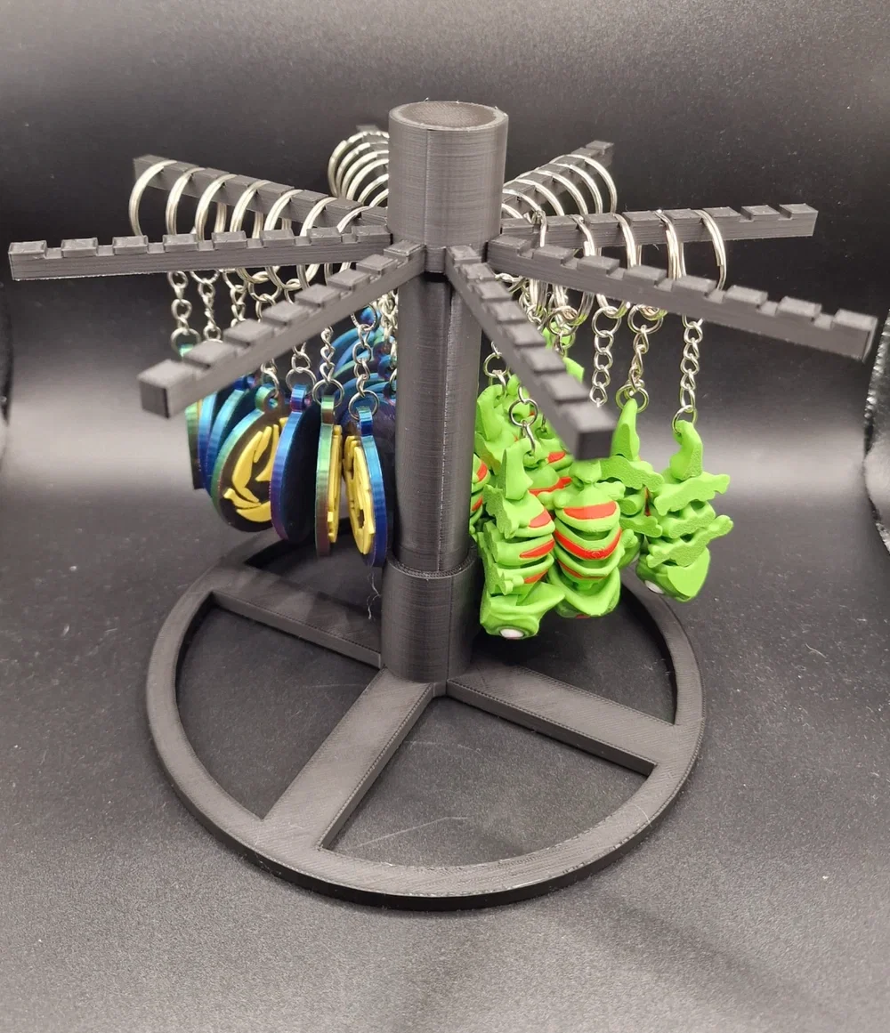 Kệ trưng bày móc khóa dạng xoay, chắc chắn, xoay mượt và không cần keo. Có profile mới với phần top để thêm nhãn/giá trong Bambu Studio, kèm tùy chọn mid wheel giúp tùy chỉnh chiều cao theo ý.