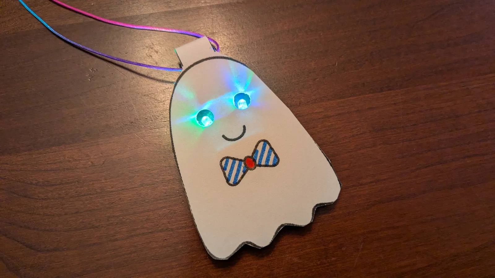 Khi lắp ráp, nhớ là LED chỉ hoạt động theo một chiều, và chân dài phải nối với cực dương của pin. Các LED được bố trí cách nhau để bạn có thể dán băng keo kẹp pin vào mặt sau của một tấm bìa (card stock) và thiết kế thành đôi mắt cho con ma hoặc nhân vật khác.