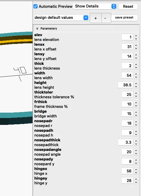 - Mở script SCAD, nhập width/height/thickness của tròng kính, rồi chỉnh các tham số khác cho đúng cho tới khi thiết kế nhìn tương tự như vầy