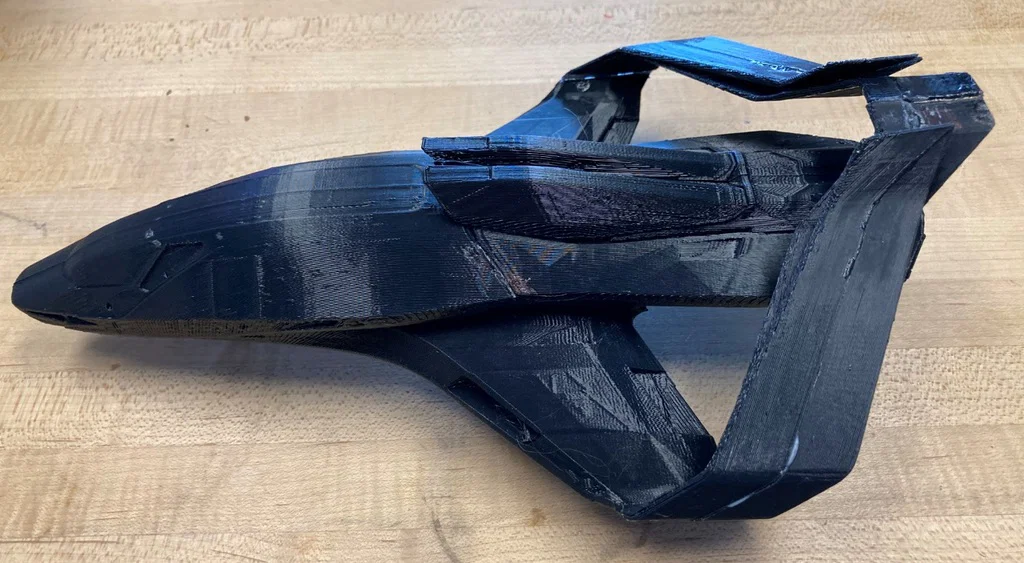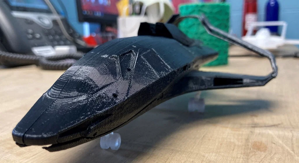 Mẫu Spaceship Model Kit gồm các chi tiết manifold, in ổn và không cần supports. Cần in mỗi chi tiết 2 cái và mirror cho đúng. Phần động cơ có nhiều bề mặt chồng lắp, có thể dùng “separate connected surfaces” trong slicer để tránh lỗi.