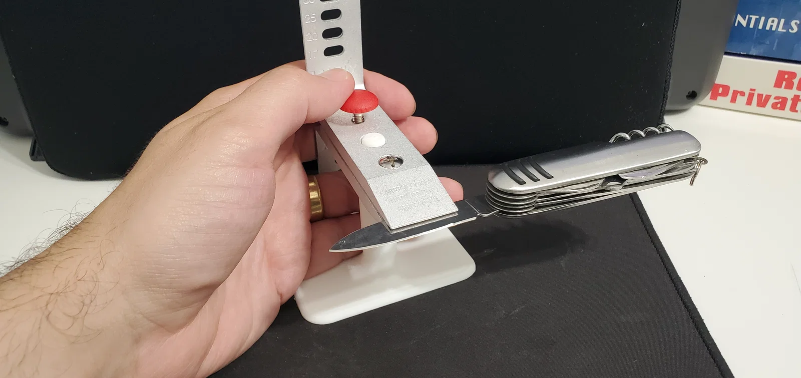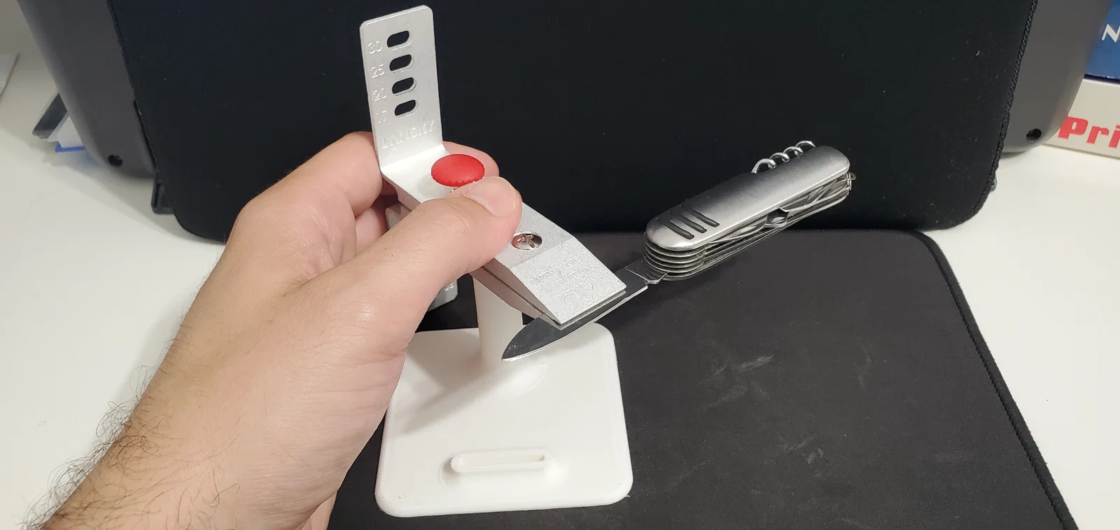 Mình mua bộ “Lansky Deluxe 5-Stone Sharpening System”, nhưng tiếc là nó không kèm đế, nên bạn phải tự cầm cái clamp. Cái stand không bắt buộc, nhưng có thì tiện hơn rất nhiều.