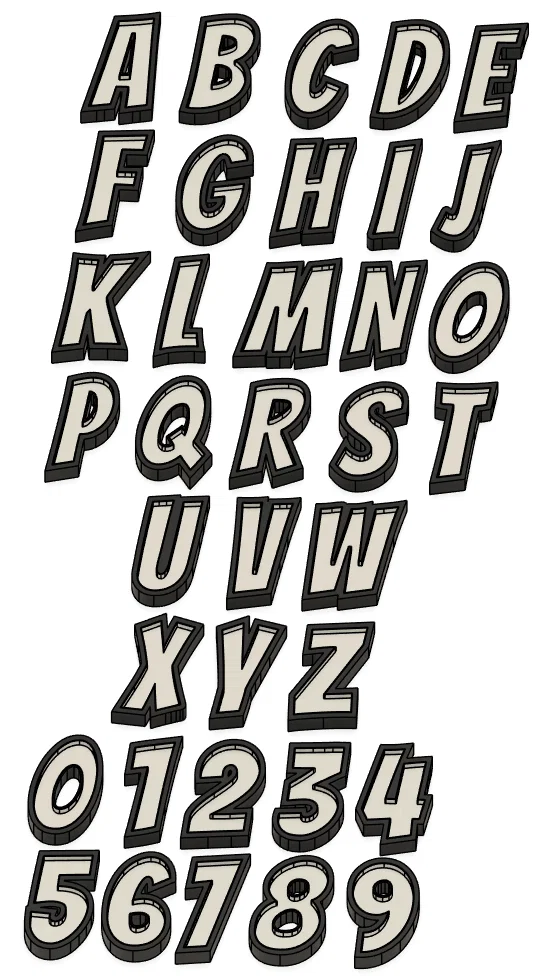 Bộ chữ cái và chữ số in 3D gồm thân màu đen và nắp màu trắng. Nắp có thể backlight bằng LED tạo hiệu ứng đẹp mắt, phù hợp trang trí cá nhân hoá. In từng ký tự rồi lắp ghép thành tên, từ hoặc viết tắt.