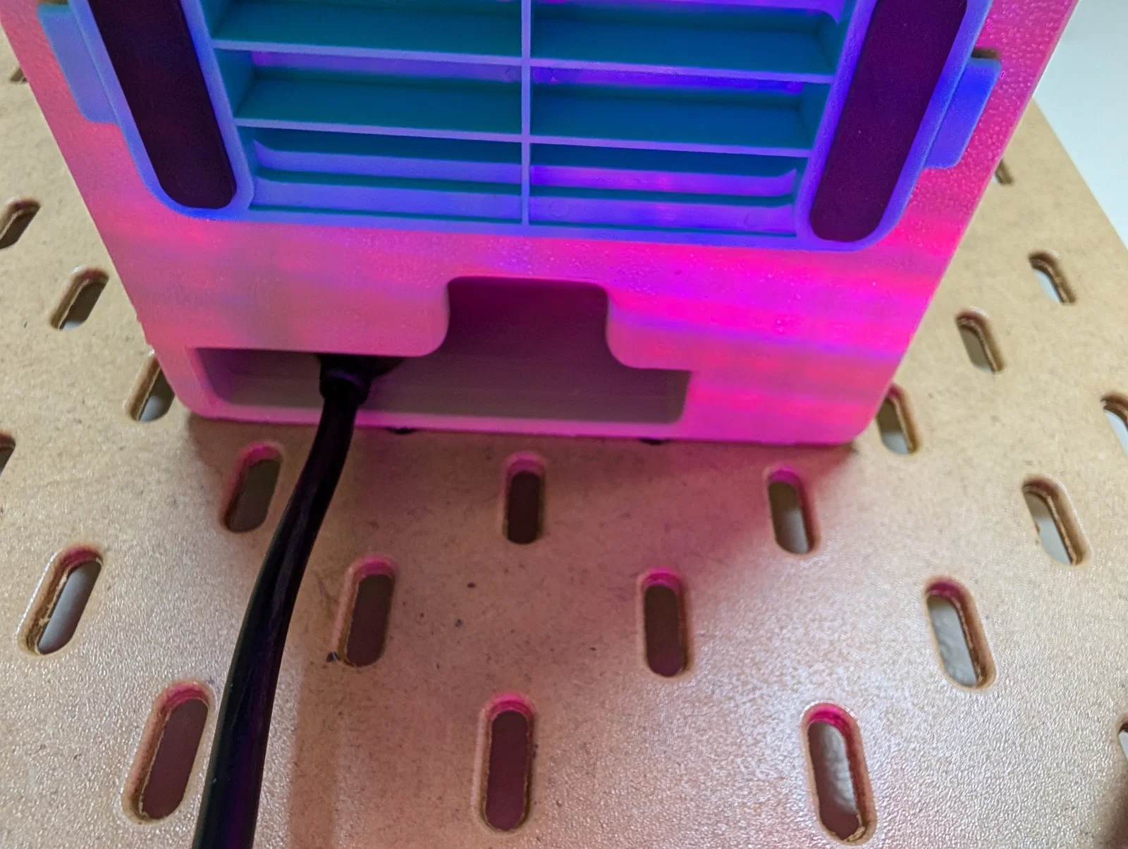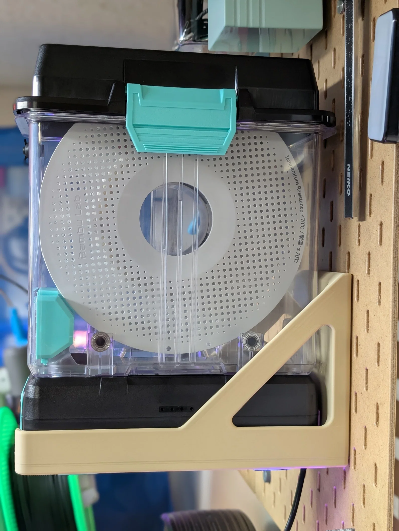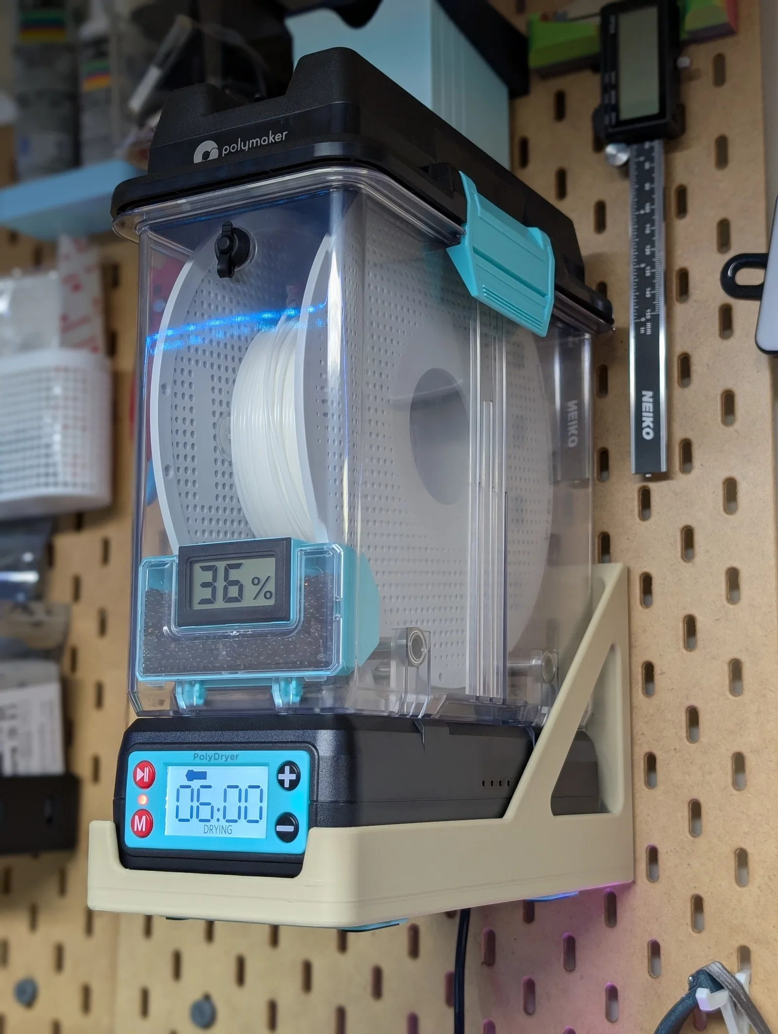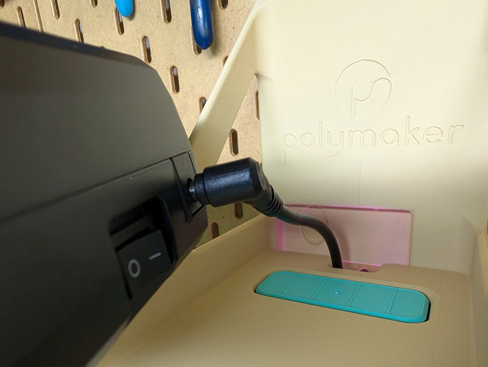 Mẫu giá treo thực dụng cho Polymaker Polydryer để gắn lên bảng Ikea Skadis, tiết kiệm diện tích và vẫn thao tác được công tắc nguồn nhờ cutout. Lưu ý cần thêm dây nối góc 90° vì plug zin quá dài.