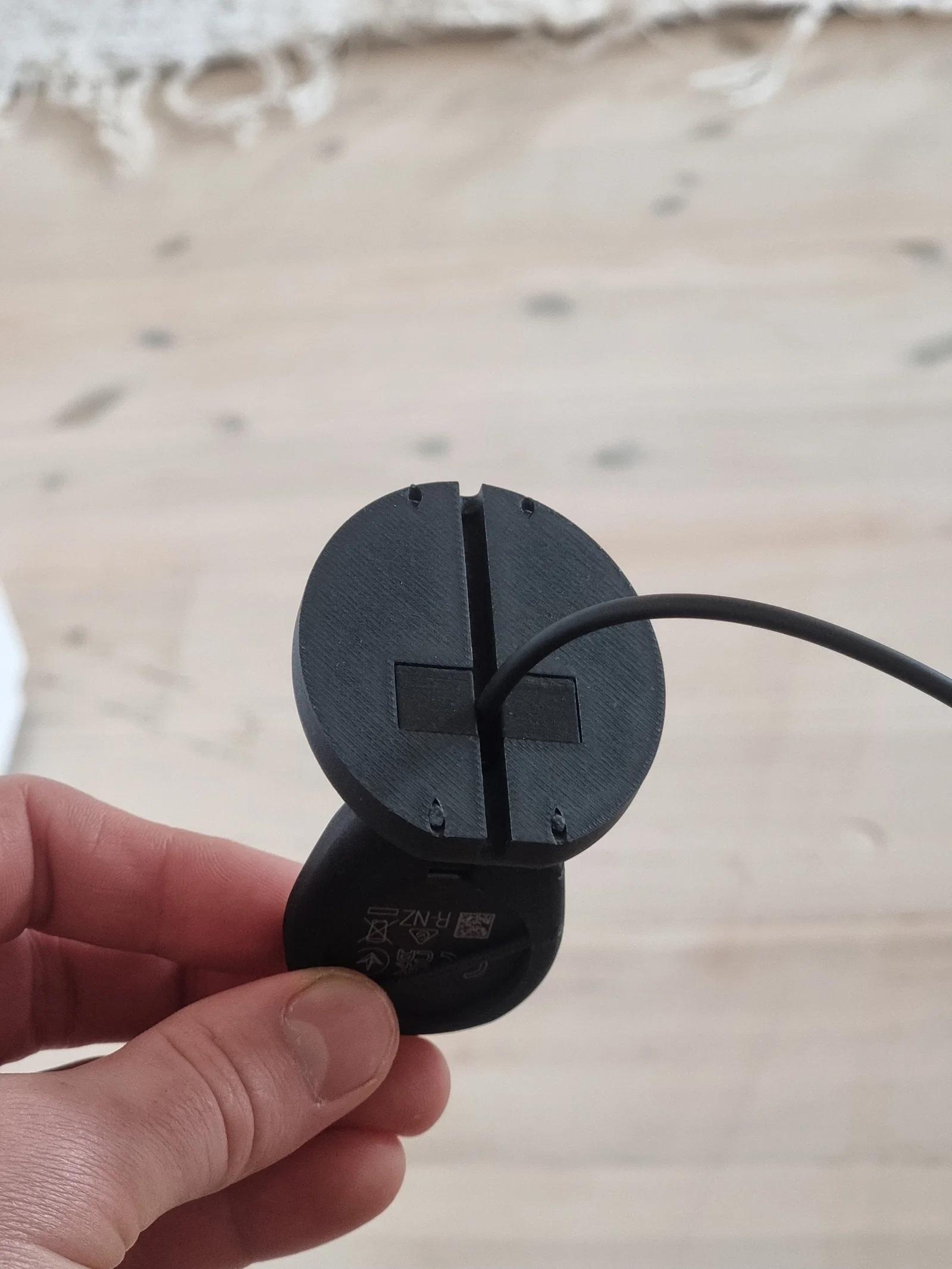 Thiết kế gồm 2 phần, có thể khoá lại với nhau bằng các lỗ luồn filament. Để ra kết quả tốt nhất, mình khuyên dùng layer height thấp để các lỗ filament canh khít, giúp siết 2 phần dễ hơn và giữ bộ sạc chắc chắn tại chỗ.
