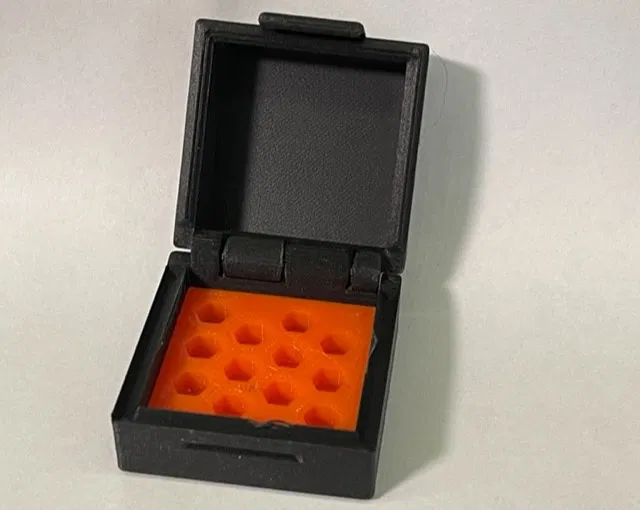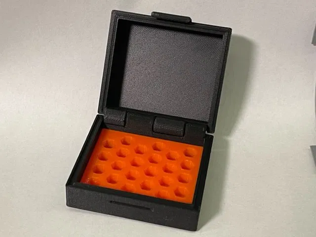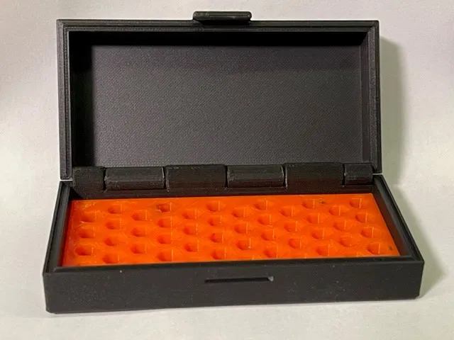 Cái đế đựng mũi vít LTT này có nhiều phiên bản (12, 24, 36, 48, 60 mũi). Vỏ ngoài in liền bản lề, phần giữ mũi bên trong in bằng TPU để giữ chặt mũi vít. Có tùy chọn khóa nam châm.