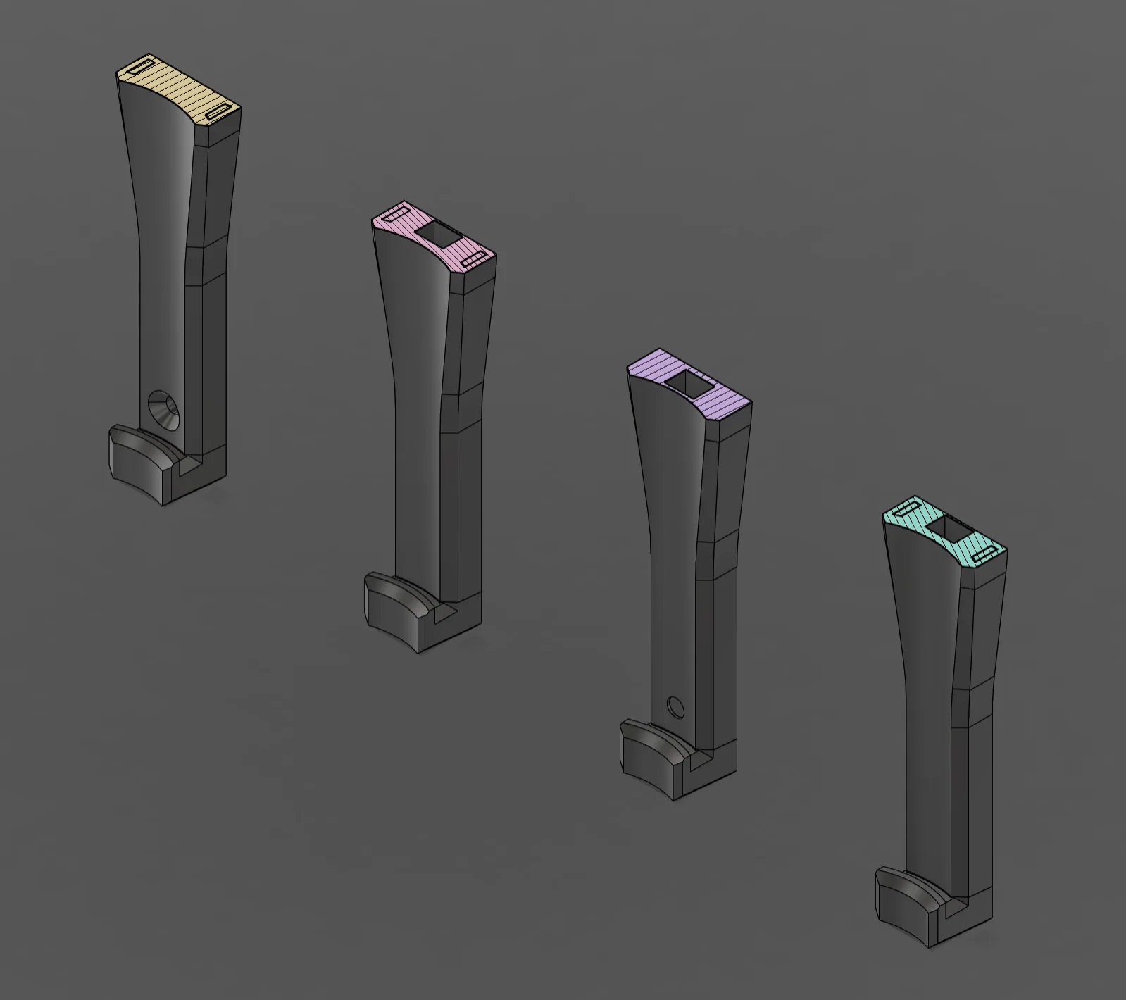 Mình bắt đầu với bản “a” trong garage, nhưng sau đó có ông bạn hỏi mình có thể chỉnh lại để dính lên tool box của ảnh không, nên bản “b” ra đời. Rồi mình nghĩ có thể dùng nam châm và thay hết các giá kẹp bình kiểu bản “a”, vậy là có thêm bản “c”. Cuối cùng, cái tool box nói trên lại để trong trailer, nên chỉ cần xóc mạnh là bình bị bật khỏi giá. Mình chỉnh tới chỉnh lui cho tới khi bình được giữ thêm một chút ma sát (nhưng không quá chặt để còn rút ra được) và tựa bằng nam châm, từ đó mấy cú xóc không còn là vấn đề với bản “d”.