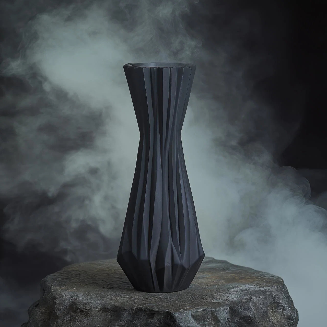 Onyx Vase là mẫu bình hoa dáng cao thon với các rãnh đa diện sâu và lớp matte black sang, tạo hiệu ứng ánh sáng–bóng tối tinh tế. Hợp decor tối giản/hiện đại, dùng cắm hoa thân cao hoặc trưng bày như điểm nhấn.