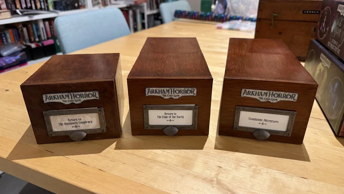 Những hộp đựng thẻ này được model theo các hộp mở rộng “Return To” phát hành cho Arkham Horror Living Card Game. Fantasy Flight đã ngừng phát hành các hộp này từ vài campaign trước, nên bạn có thể dùng mấy hộp này để hoàn thiện bộ sưu tập của mình :-)