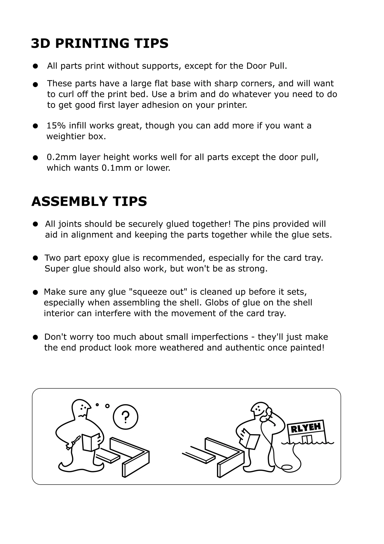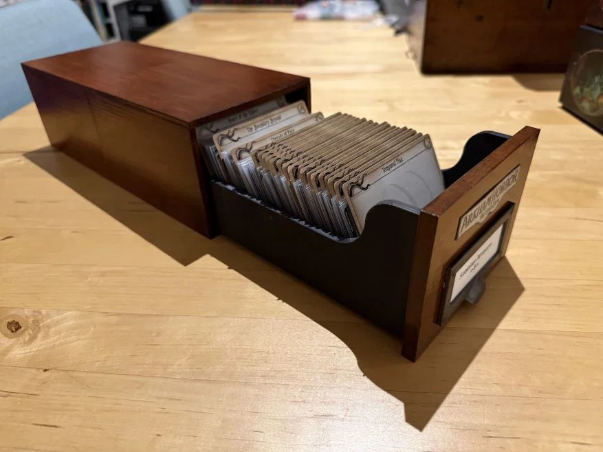 Bộ hộp đựng thẻ kiểu “Return To” cho Arkham Horror LCG, kích thước khớp hộp gốc. Có nhiều bản STL theo chiều dài (170/200/240/296mm) và bản 296mm split, kèm file Fusion 360 để tuỳ chỉnh.