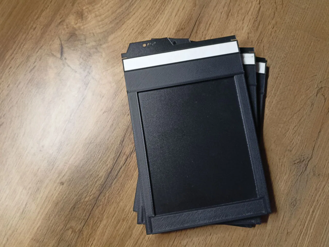 Phiên bản 9x12cm của Standard film holder 4x5", dùng dark slide 0.5mm cắt từ bìa nhựa đen A4. In không cần supports, có seal nhung cho lỗ dark slide. V2 tối ưu khe 0.5mm, dài hơn và có template .svg.