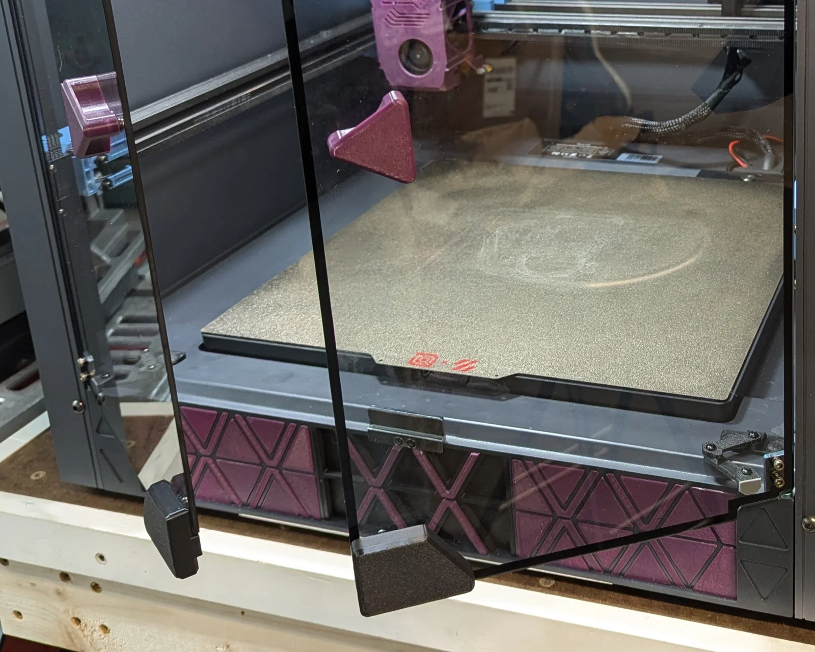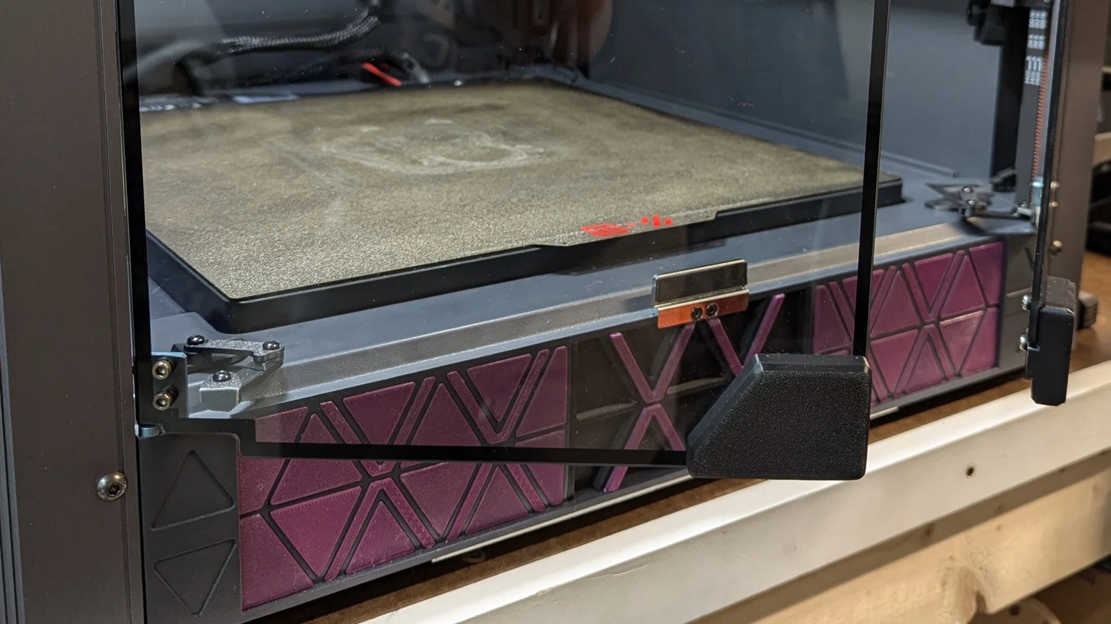 Mình đang tìm một giải pháp giữ cửa kiểu “bán cố định” cho SV08: gắn sẵn đó luôn nhưng khi cần bảo trì linh kiện thì vẫn tháo ra nhanh gọn. Cái door prop này có thể giữ cửa hé mở để in PLA, hoặc đẩy qua điểm cân bằng (over center) để giữ cửa mở hết cỡ cho dễ thao tác bên trong máy in. Mình thiết kế cho enclosure OEM, nhưng cũng có thể dùng được hoặc chỉnh sửa để hợp với enclosure DIY.