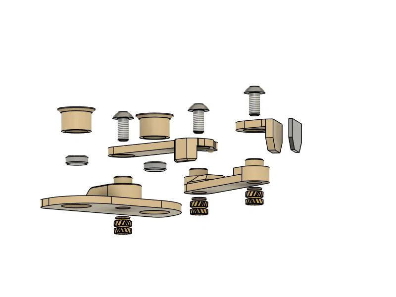- Lắp ráp các phần bằng vít M3x6, và kiểm tra mọi khớp xoay trơn. Có chút ma sát ở phần detente là bình thường, nhưng kẹt/bó hoặc bị vặn lệch thì không ổn.