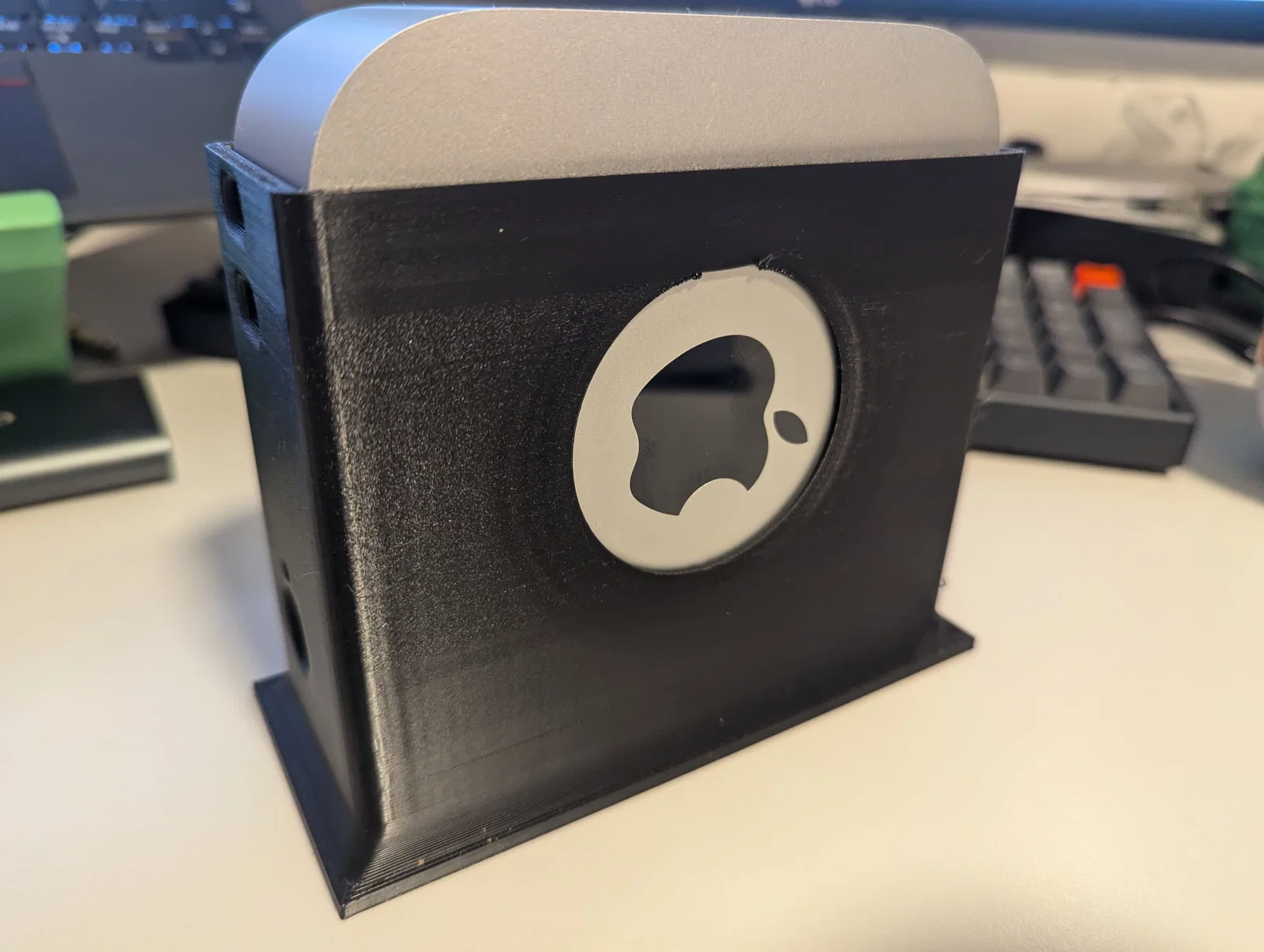 Một cái đế dựng đứng nhỏ gọn cho Mac Mini, giúp tiết kiệm diện tích trên bàn mà vẫn đảm bảo thông thoáng, tản nhiệt tốt. Gắn thêm miếng dán chống trượt để bám chắc hơn.