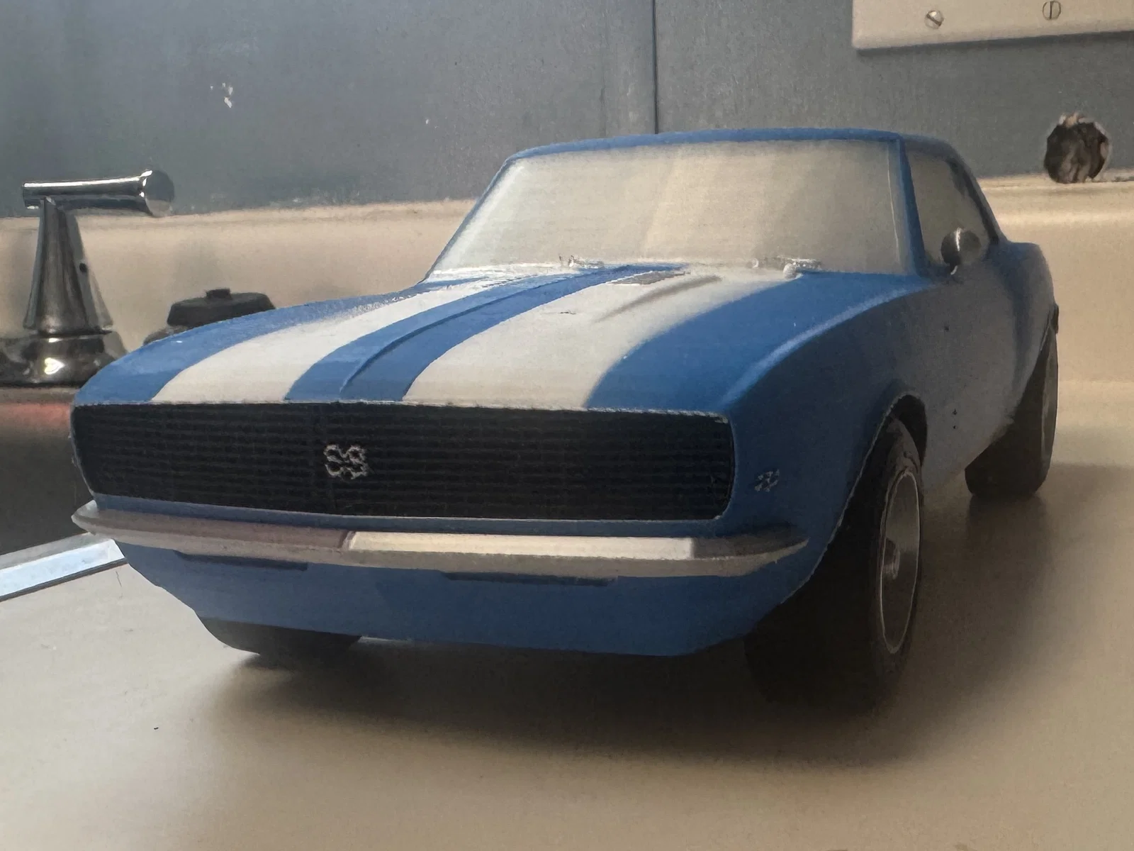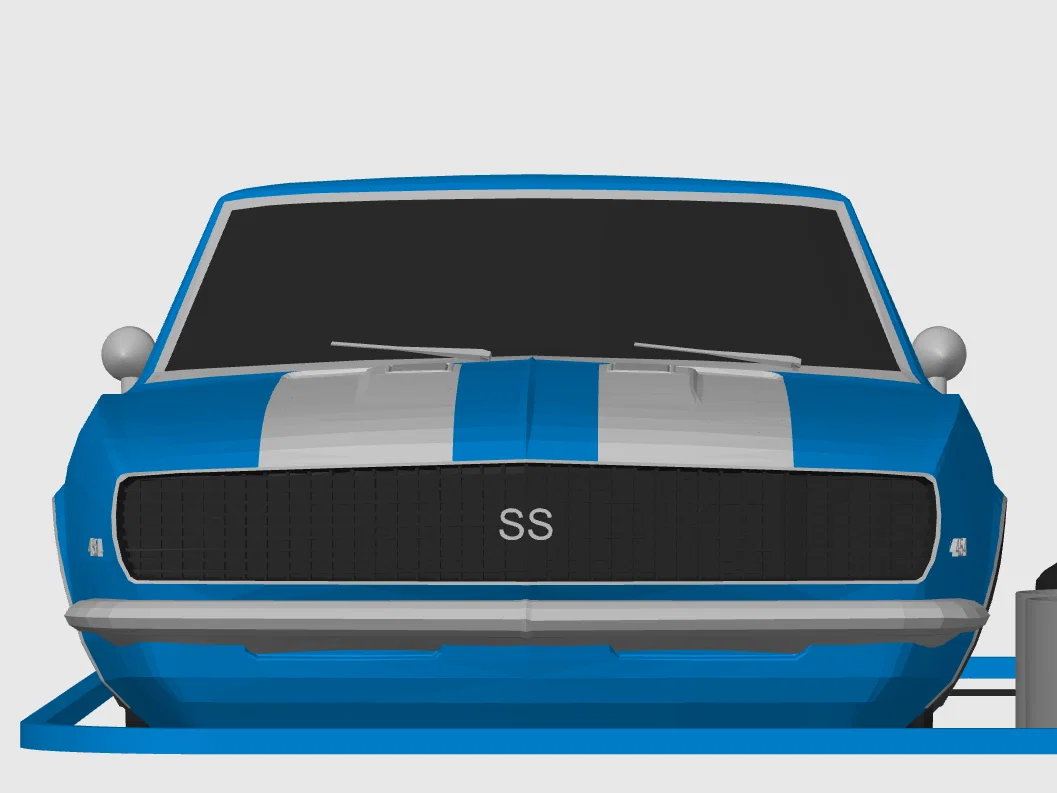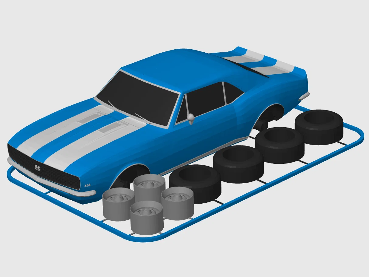 Mô hình Chevrolet Camaro RS/SS 1967 dạng kit card tỉ lệ 1:24. In xong lắp bằng ngàm tích hợp, bánh xoay được (xe không lăn). Có STL một màu và 3MF preset màu cho AMS/MMU, tùy chọn có/không racing stripes.