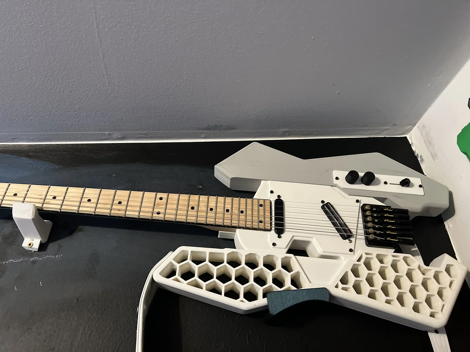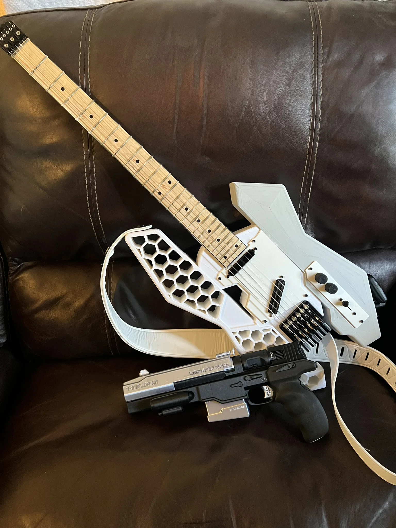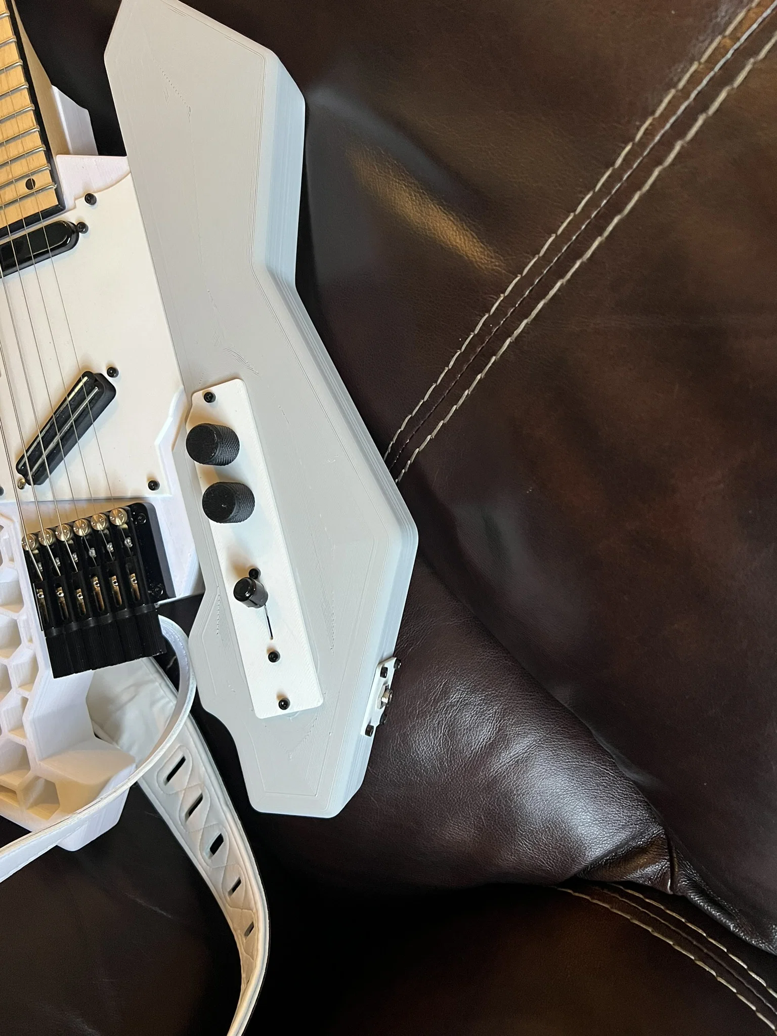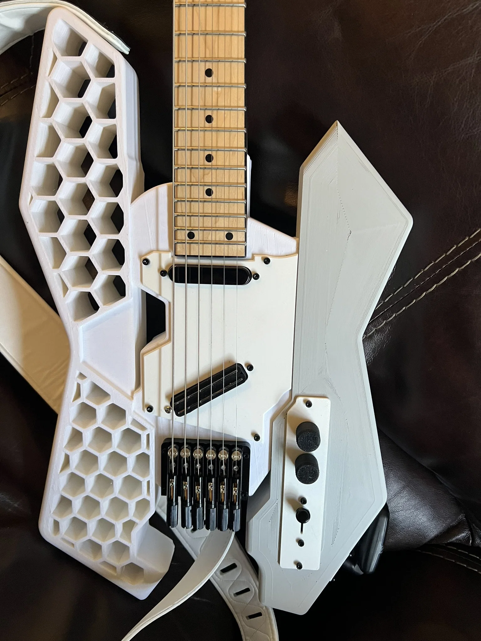 Prusacaster 2077 phiên bản headless, cổ không có headstock để lên đúng vibe Cyberpunk. File có faceplate mới cho 2 pickups, tăng không gian đi dây, thêm jack/control plate, kèm STEP và 3mf cho máy in khổ lớn như Neptune 4 Max.