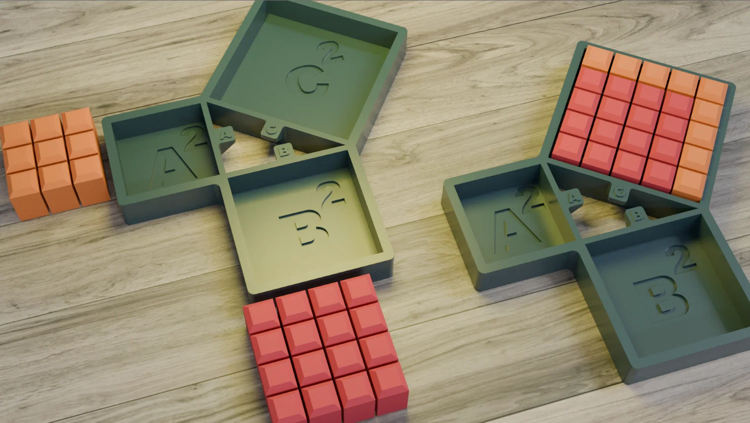 Mẫu 3D này mô phỏng một tam giác vuông và diện tích các hình vuông trên các cạnh của nó, giúp minh hoạ định lý Pythagoras: