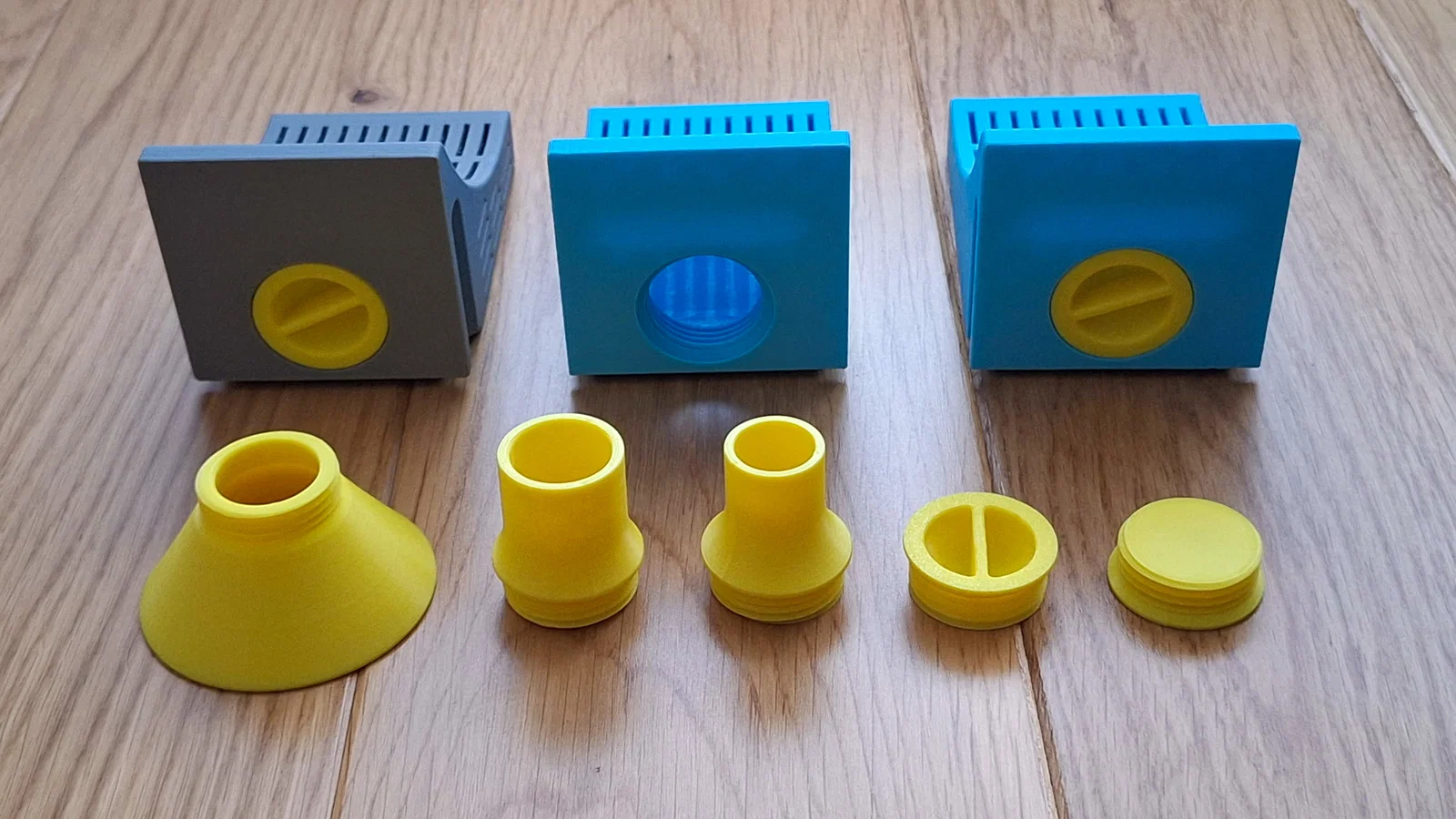 Mẫu hộp đựng silica gel tách rời cho Samla 22L: tối đa 8 hộp (mỗi hộp ~90g), có nắp vặn in 3D, phễu châm và ống xả sạch sẽ. In PETG/PLA, layer 0.2mm, infill 15%, không cần support.