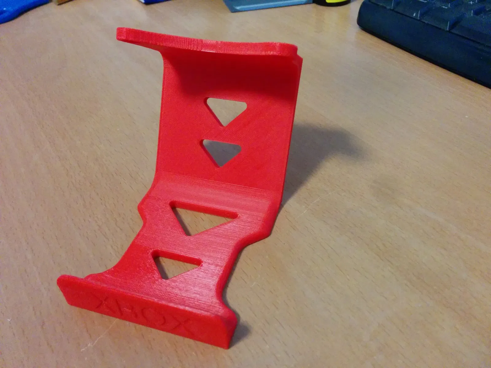 Nguyên mẫu đầu tiên trong các bức ảnh được in bằng PLA, 200 µm, 15% độ đặc, 2 vòng ngoài, và rất chắc chắn. Tôi đã tối ưu hóa thiết kế để in mà không cần hỗ trợ. Tuy nhiên, mặt sau của phần trước (được đánh dấu bằng "XBOX") có một số gợn sóng nhỏ.