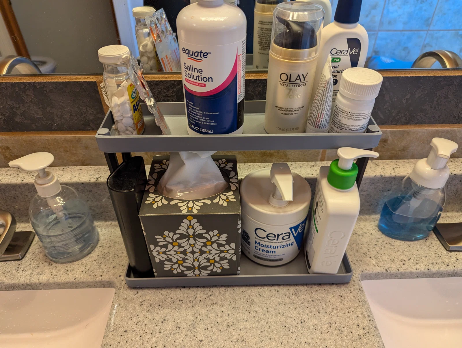 Khay/khung organizer 2 tầng để trong phòng tắm hoặc trên mặt bàn. Kích thước khay dưới là 300mm x 121mm. Kích thước khay trên là 300mm x 75mm. Các pát/giá đỡ khay trên làm tổng chiều cao tăng thêm 165mm, nên chiều cao hoàn thiện tới mặt trên của tầng trên khoảng 205mm.