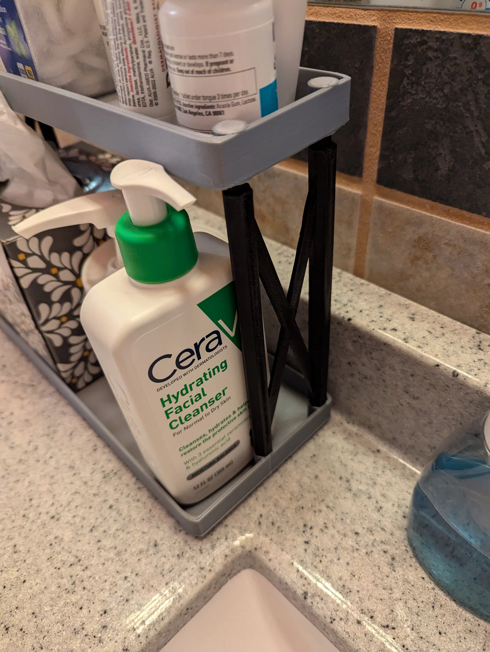 Organizer 2 tầng để bàn dùng cho phòng tắm hoặc bếp, gồm bản 300mm cho máy khổ lớn và bản 200mm cho máy in tiêu chuẩn. Chân đỡ lắp khít, có thể cần gõ nhẹ khi lắp.