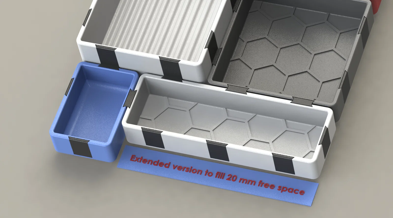 Các model này dài hơn 20 mm theo một hướng so với các model nguồn: “Catch-All Trays / Desk organizer & Catch-All Trays / Desk organizer - stackable remix &