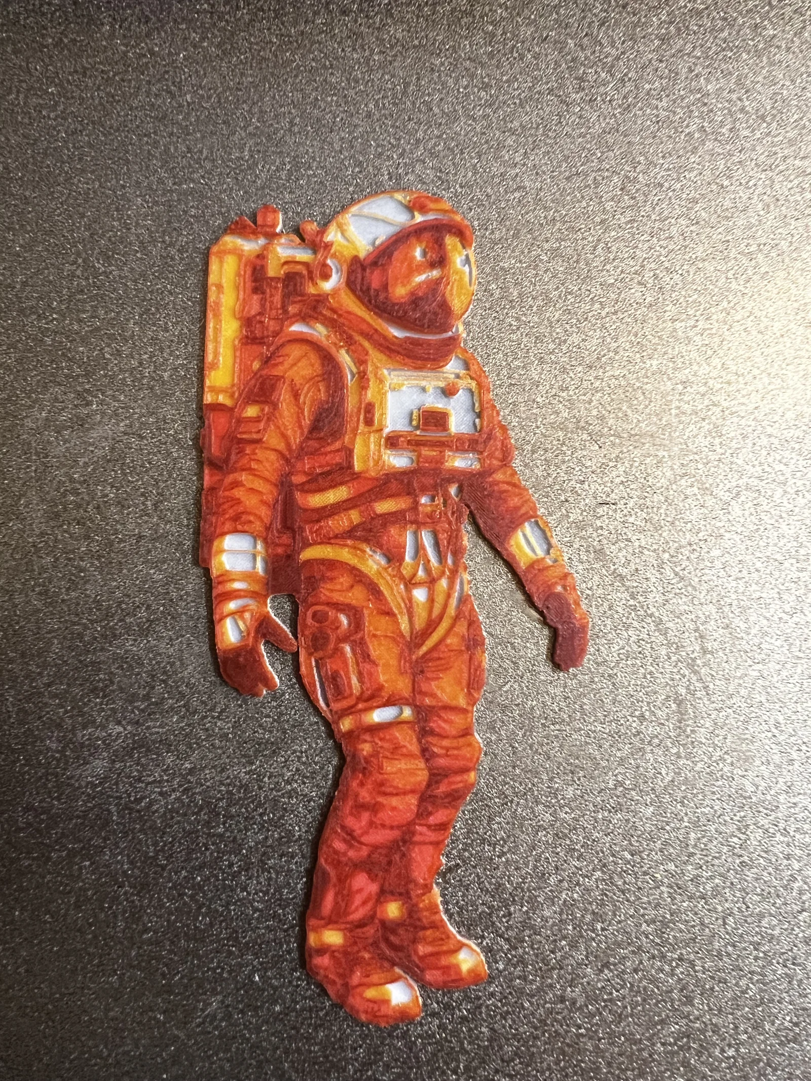 Mẫu HueForge demo kiểu vẽ với phi hành gia được đổ bóng, rất “dễ tính” khi chọn filament. Chỉ cần đen ở đáy và trắng ở lớp trên, còn giữa dùng 2 tông cùng màu (xám, xanh, xanh lá, tím–hồng...) là ra đẹp.