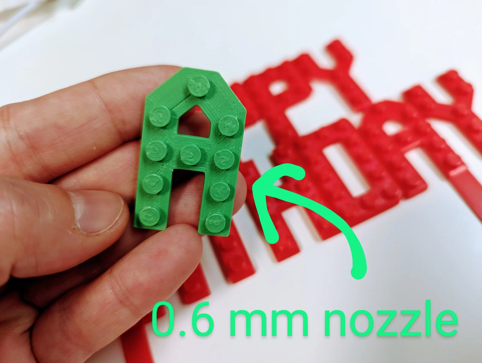Mình cũng in thử vài lần với nozzle 0.4 mm và 0.6 mm; đúng là in nhanh hơn nhiều, nhưng không dễ để build lên trên — nên nếu bạn quan tâm độ chính xác và muốn ghép Lego lên được, hãy dùng nozzle nhỏ như 0.2 mm hoặc 0.25 mm. Còn nếu bạn chỉ cần in nhanh để xài cho bữa tiệc rồi bỏ thì cứ 0.6 mm, nhìn xa vẫn ổn!