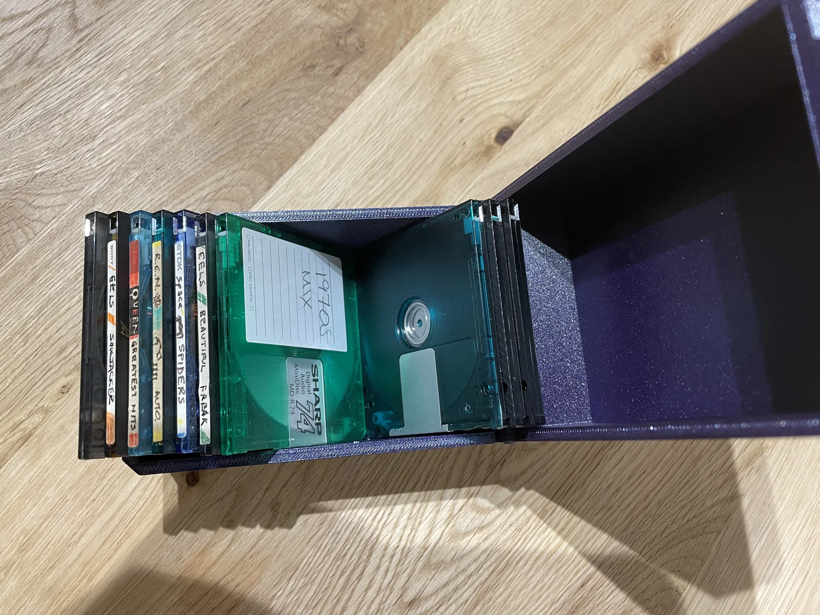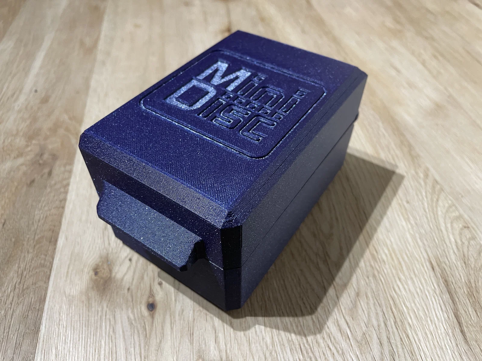 Hộp lưu trữ đơn giản cho tối đa 22 minidisc (không kèm case), thiết kế để lật xem từng đĩa. In 1 base, 1 lid và các mảnh hinge; có thể cần chỉnh đường kính axel và làm sạch support ở lỗ bản lề.