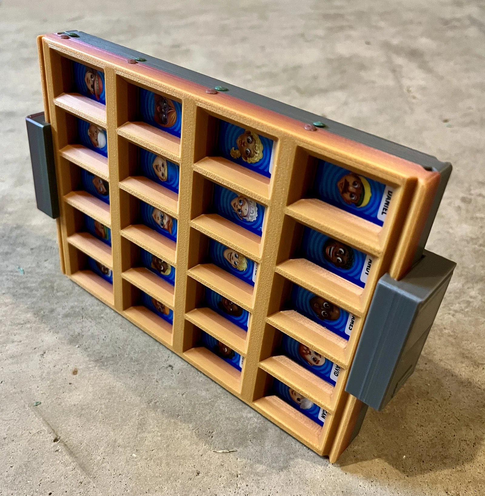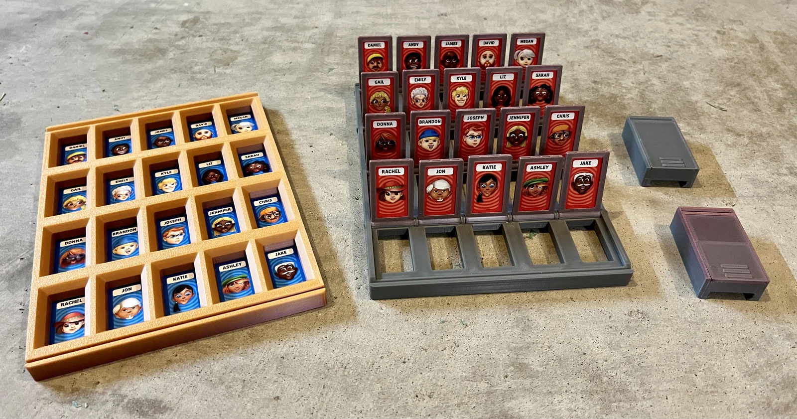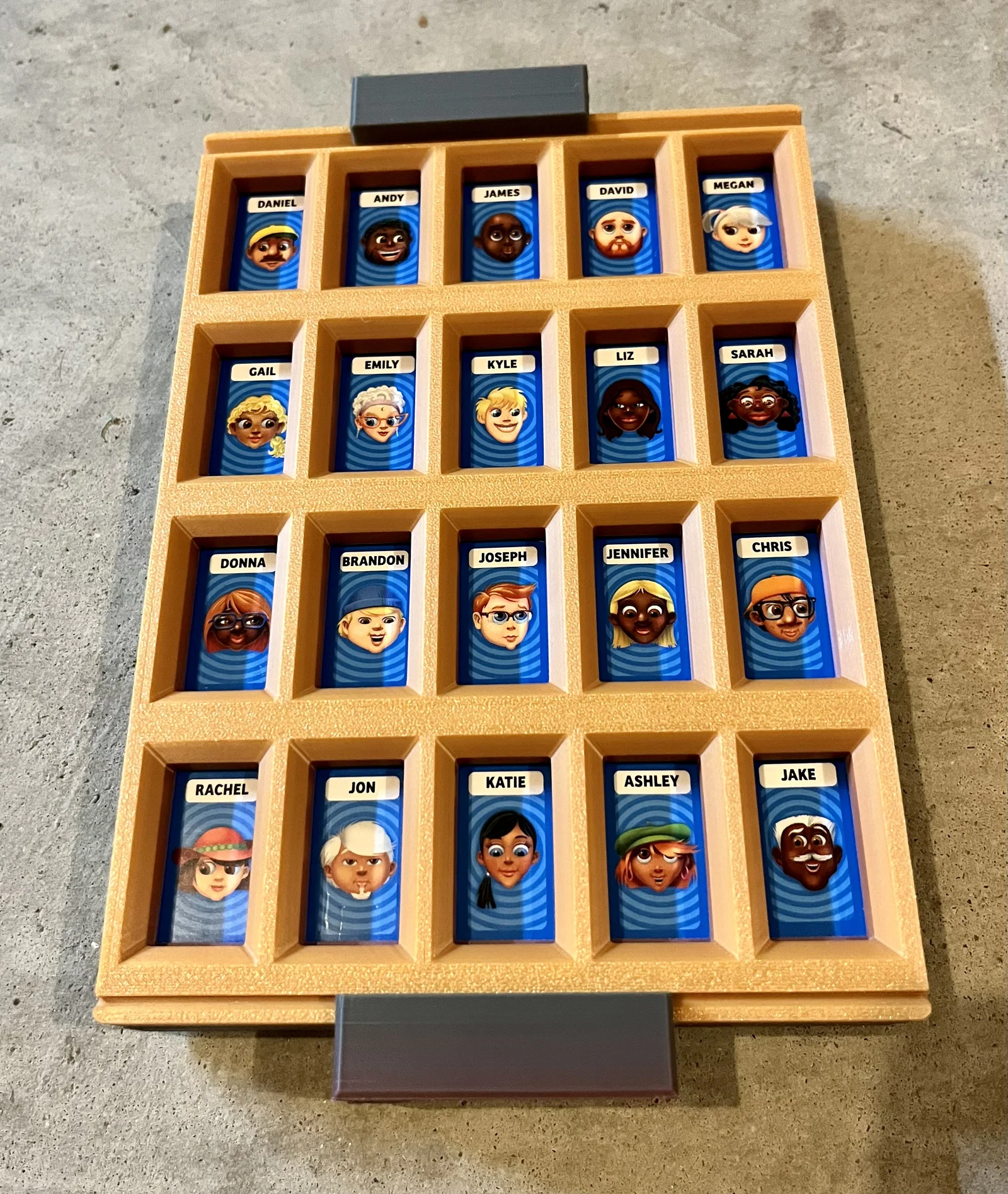 Mình mua cho con gái bộ Travel Guess Who dạng Grab & Go nhưng thiết kế quá tệ nên làm lại gần như toàn bộ. File in 3D gồm board, connector, nắp và 40 tiles; có chừa tolerance để lắp khít hơn khi mang đi.