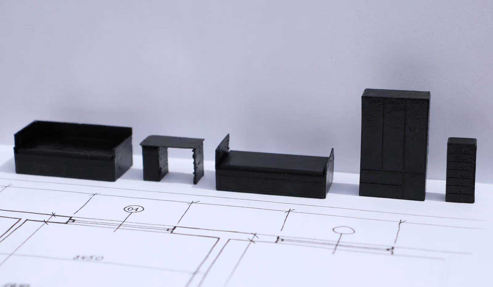 Bộ nội thất mini dùng để lên layout phòng khi không có phần mềm thiết kế. In được ở tỉ lệ 1:25 hoặc 1:50 (không khuyến nghị nhỏ hơn 1:50). Gồm tủ áo, bàn, giường và tủ ngăn kéo, kèm kích thước và thông số in PETG.