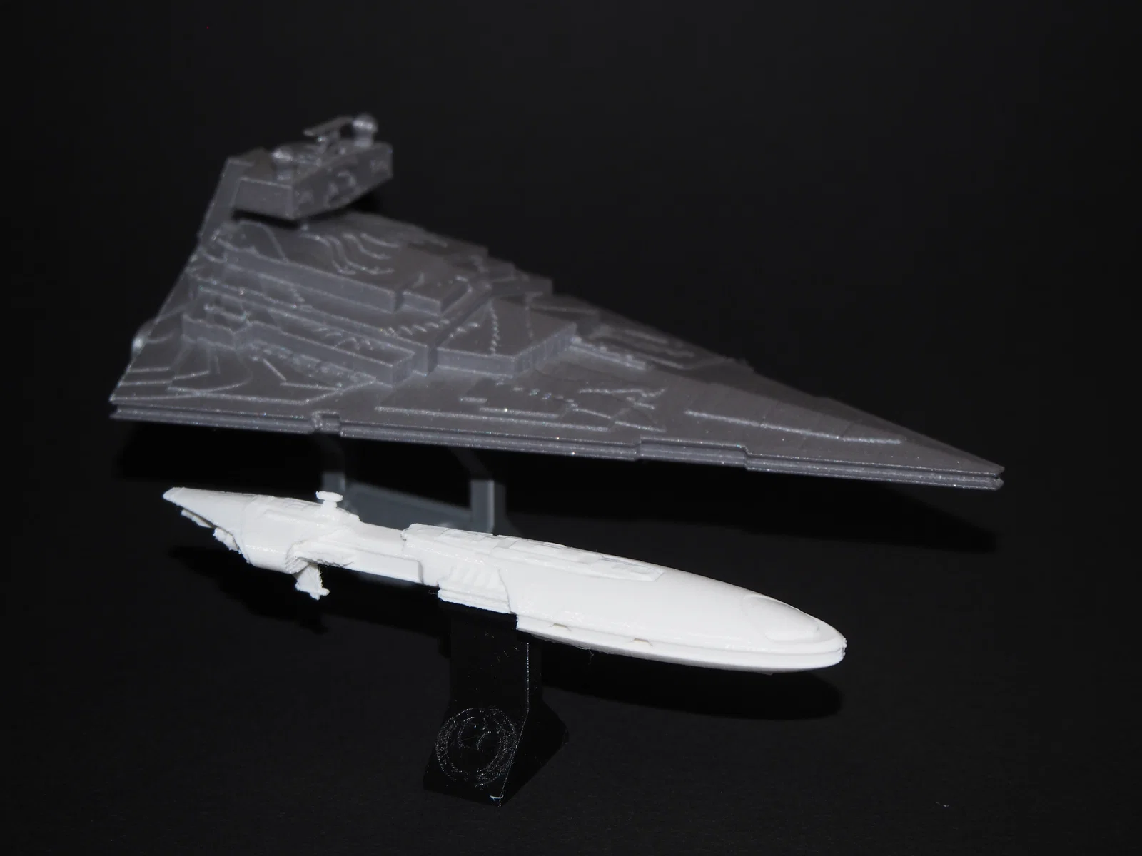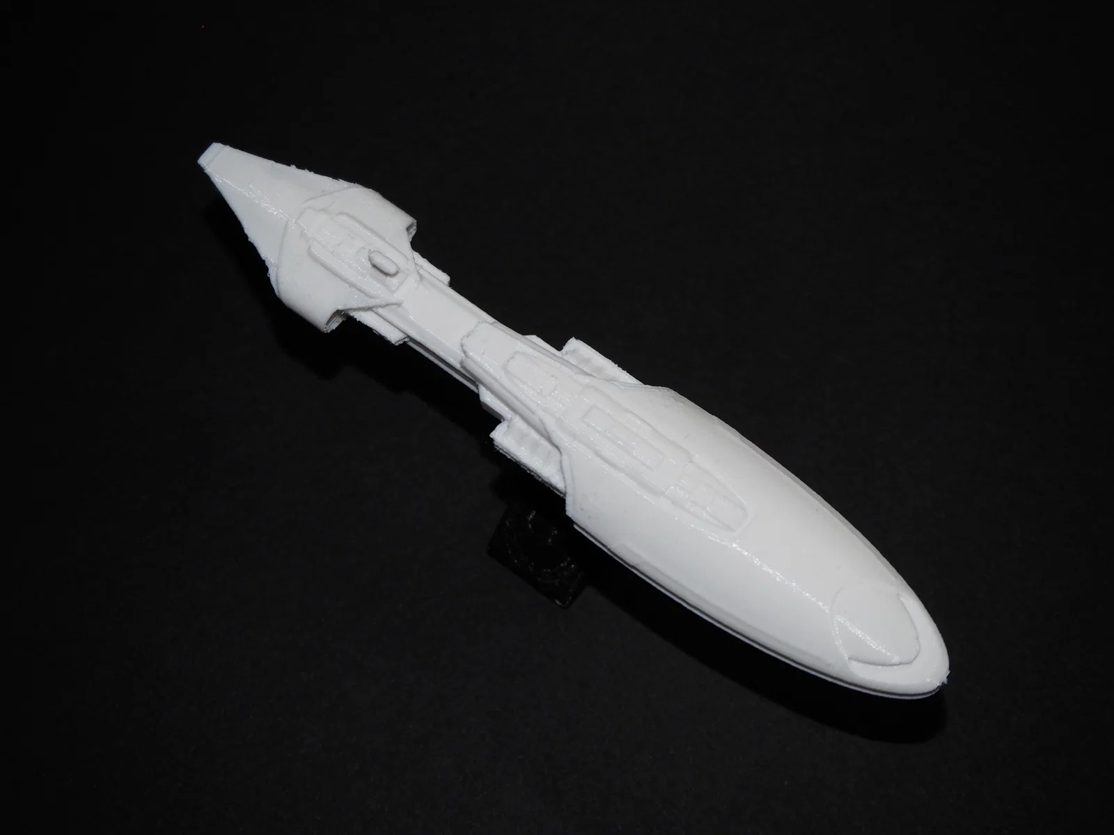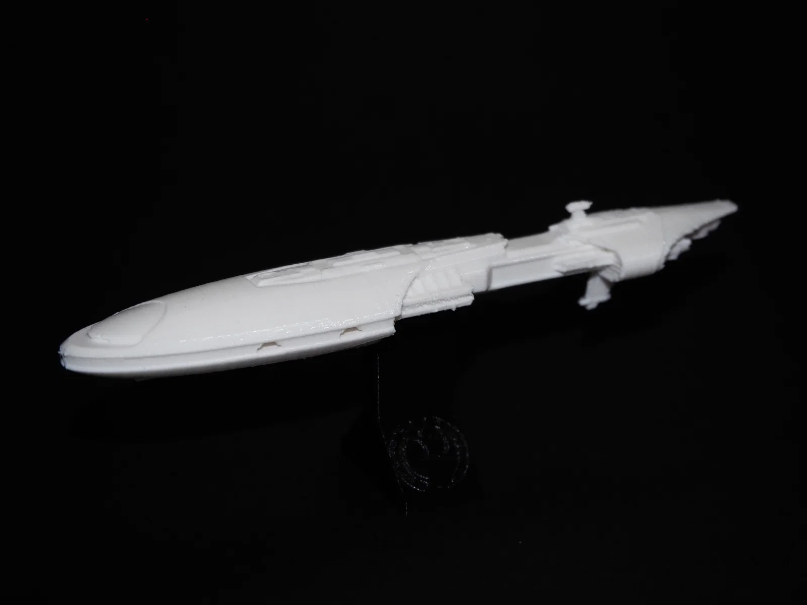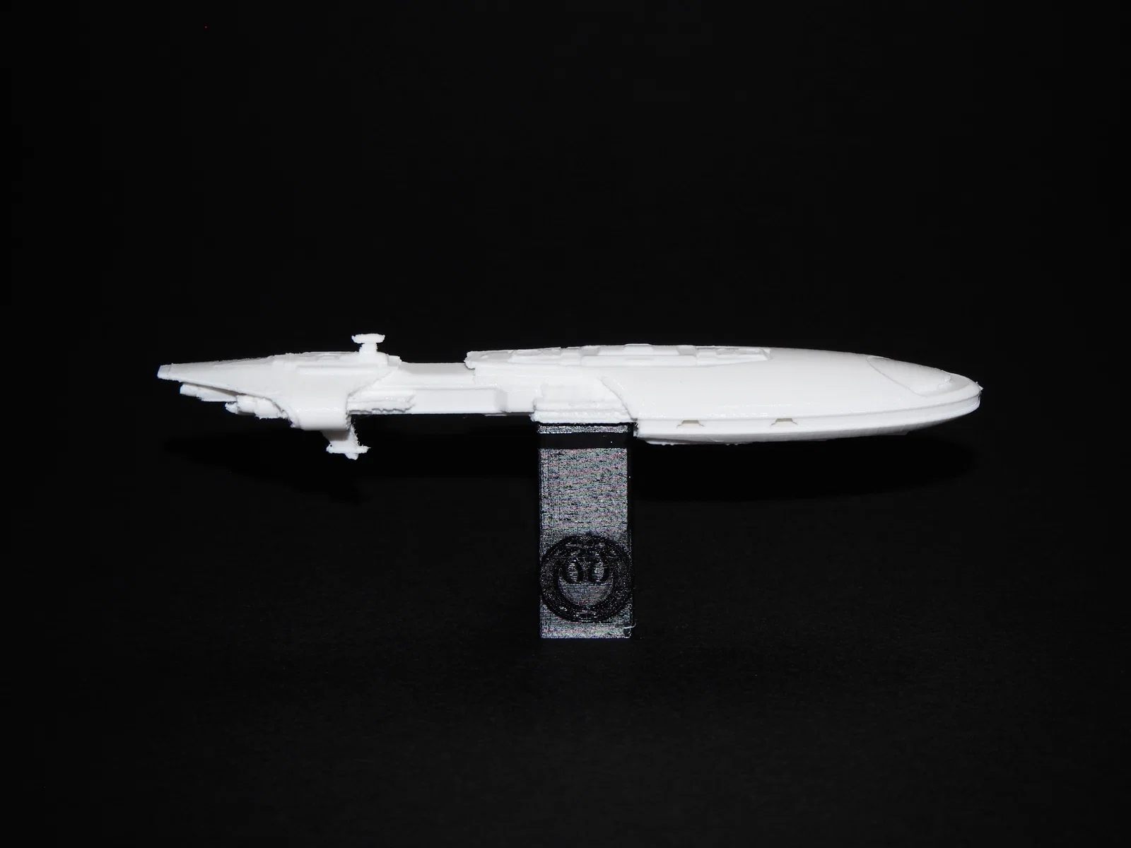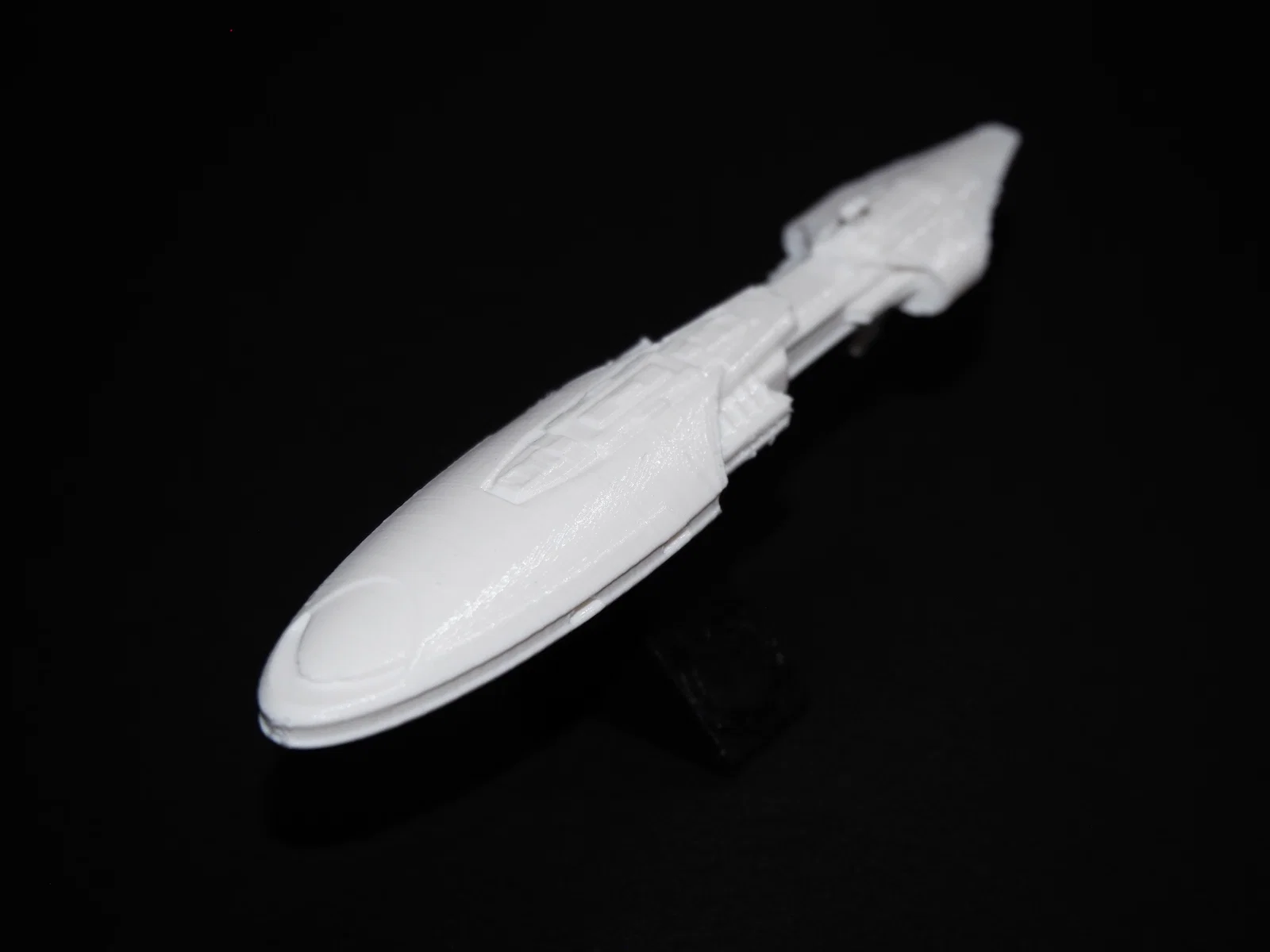 Mô hình New Republic Defender-class Cruiser trong *Star Wars: Ahsoka* (tàu *Vesper*). Kích thước 99.6 × 19.5 × 16.4mm, tỉ lệ 10,000, có kèm đế trưng. In 0.15mm, cần supports trên buildplate.