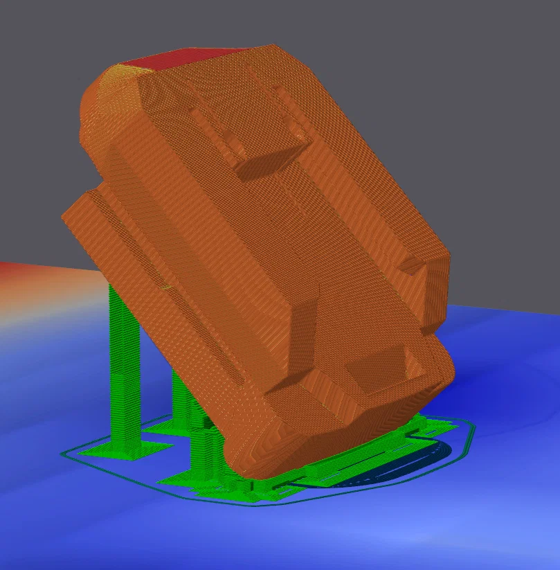 In với góc khoảng -30° như hình ở ảnh cuối để gần như không cần support (chỉ cần ở phần đế để bám bàn in tốt hơn trong lúc in).