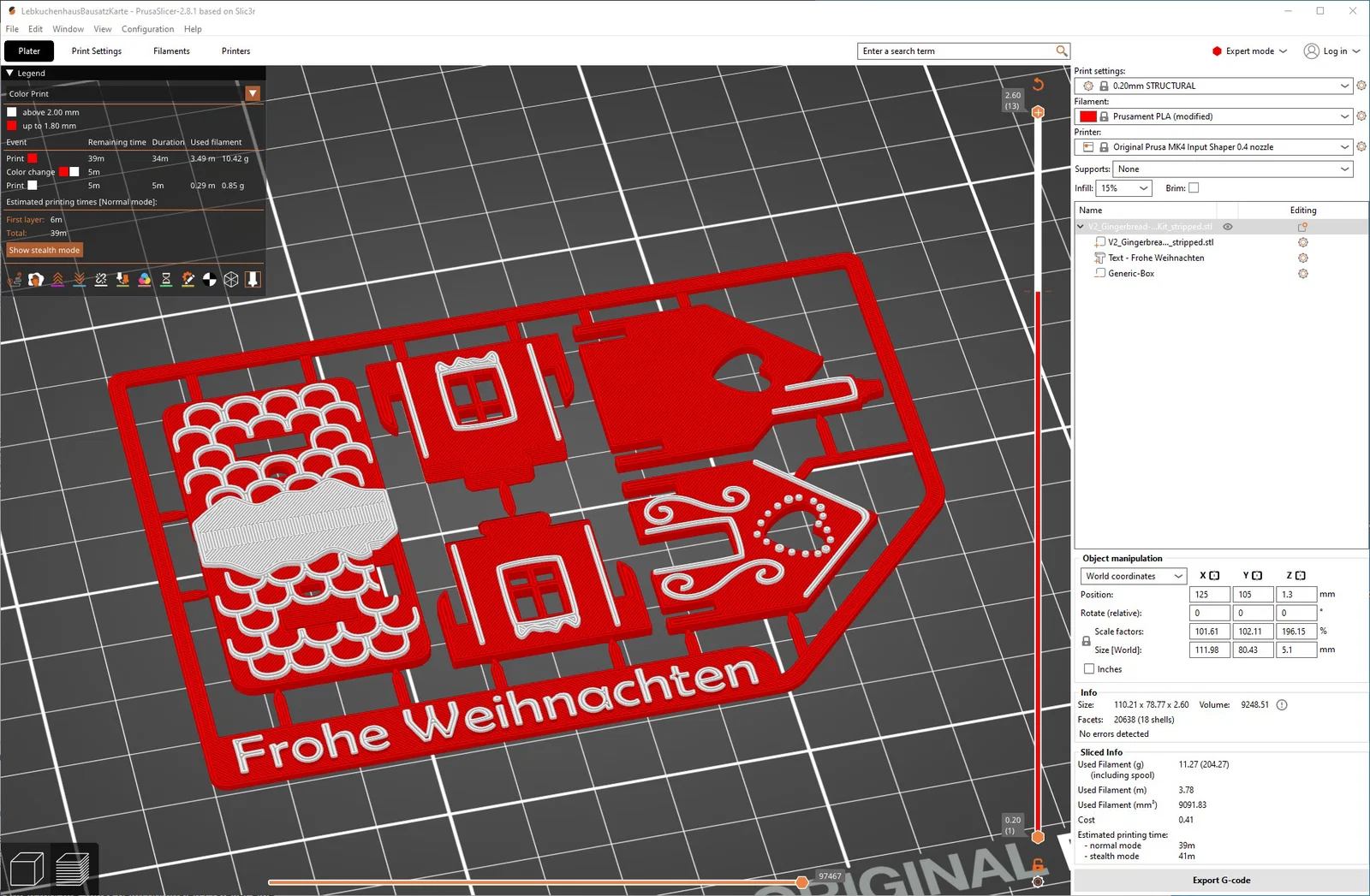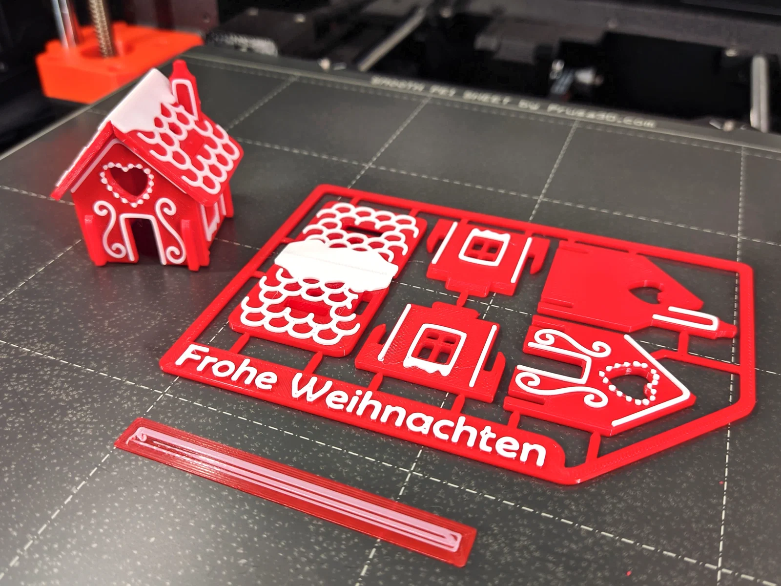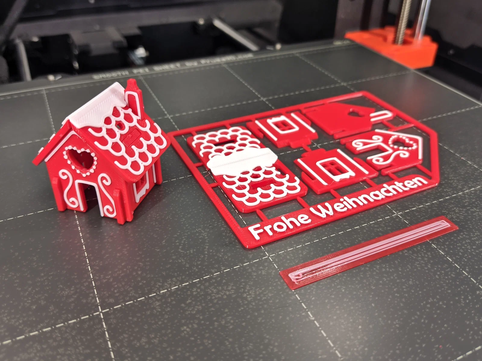 Phiên bản tiếng Đức của Gingerbread House Kit Card v2 với chữ “Frohe Weihnachten”. Tối ưu in PLA 0,2mm trên Prusa MK4, có đổi màu trước 4 lớp cuối. Mái liền có lỗ luồn dây để treo; kèm update Modifier trong 3mf và tùy chọn Wipetower.