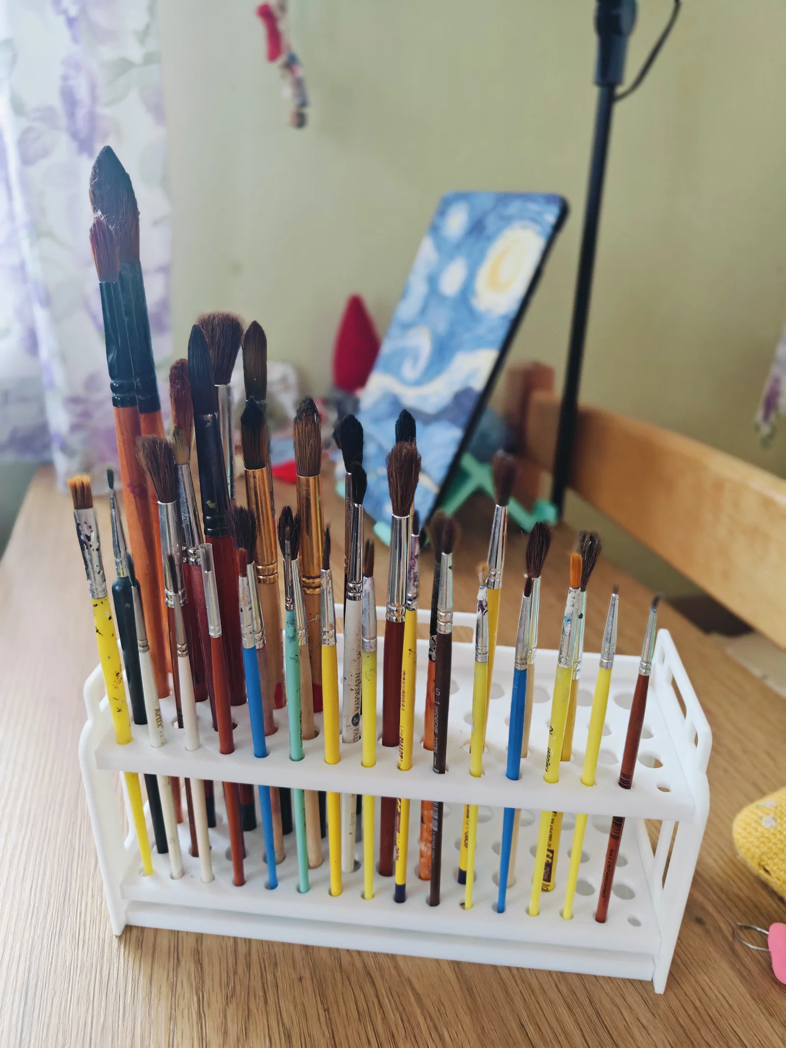 Giá để cọ vẽ này chứa được tới 53 cây cọ nhiều kích cỡ, giúp khu vực làm việc gọn gàng hơn. Có 4 hàng lỗ (13mm, 10mm, 10mm, 6mm) để cất cọ, bút, bút chì, kim đan…