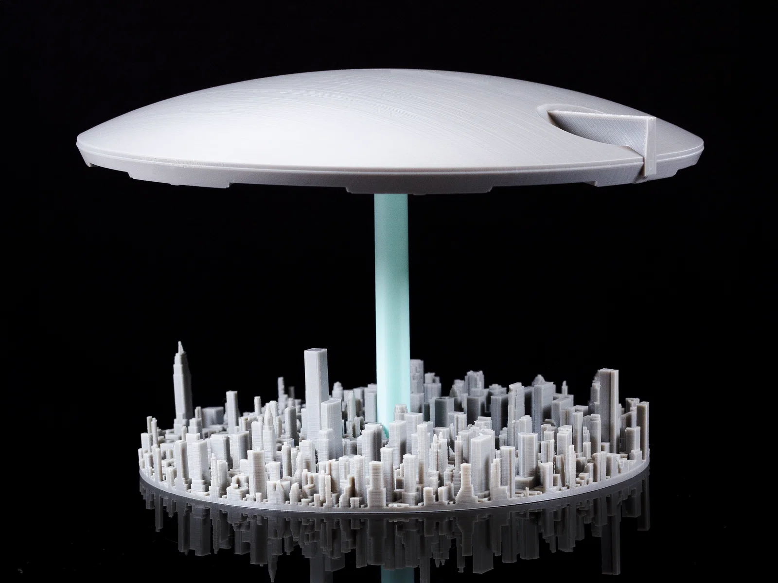 Mô hình mini chuẩn theo phim Independence Day (1996): City Destroyer đang bắn tia laser xuống New York City. In 2 nửa rồi ghép bằng connector và keo; có stand tối giản, tùy chọn bản tolerance thoáng hơn và nam châm 6x2mm.