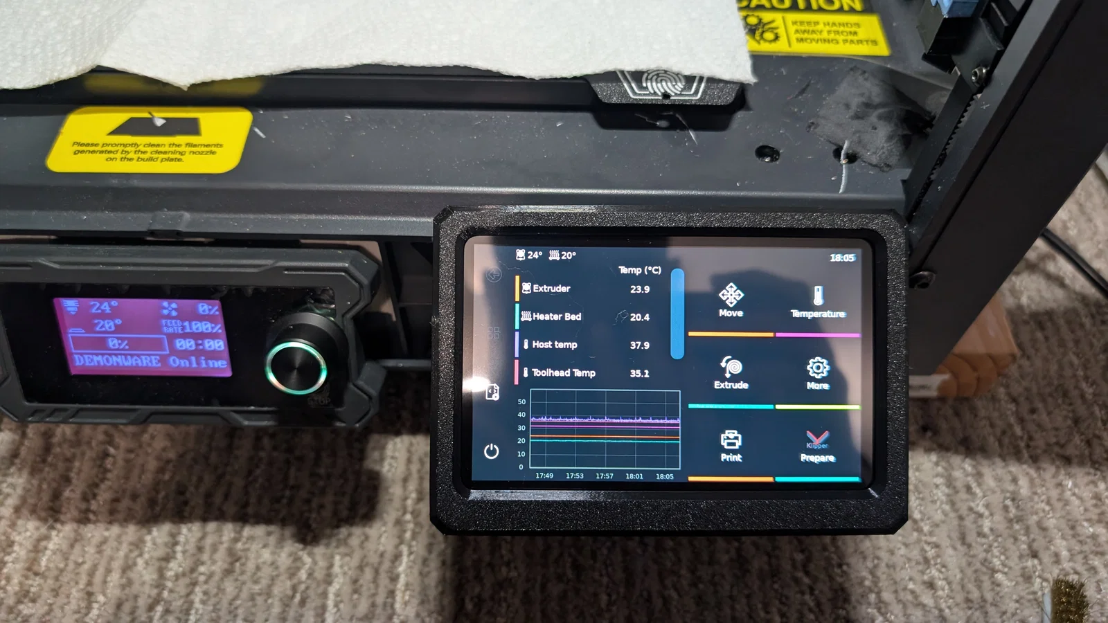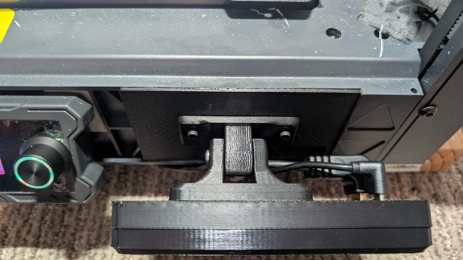 Lưu ý: thiết kế gốc dạng side-by-side yêu cầu người dùng khoan thêm vài lỗ lên khung (chassis) của SV08. Mình không thoải mái khi phải khoan và siết bu-lông kim loại sát khu vực có electronics bên dưới. Có thể không nguy hiểm, nhưng mình không muốn mạo hiểm. Nên mình dùng keo CA bôi lên các mép của base plate rồi dán màn hình vào. Tới giờ vẫn bám rất chắc. Khi cần, mình có thể nạy ra bằng metal spudgers và spatula. Tuy vậy, nếu bạn thấy ổn thì vẫn có thể khoan lỗ nhỏ và bắt vít. Mình đã để nguyên các lỗ vít trên base plate để bạn tùy chọn theo cách này.