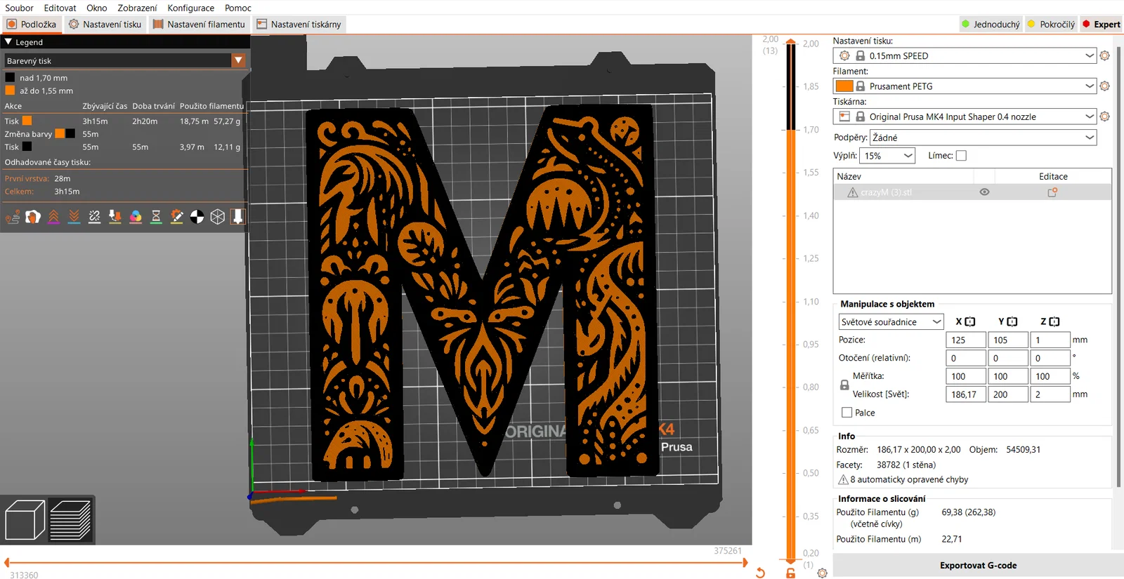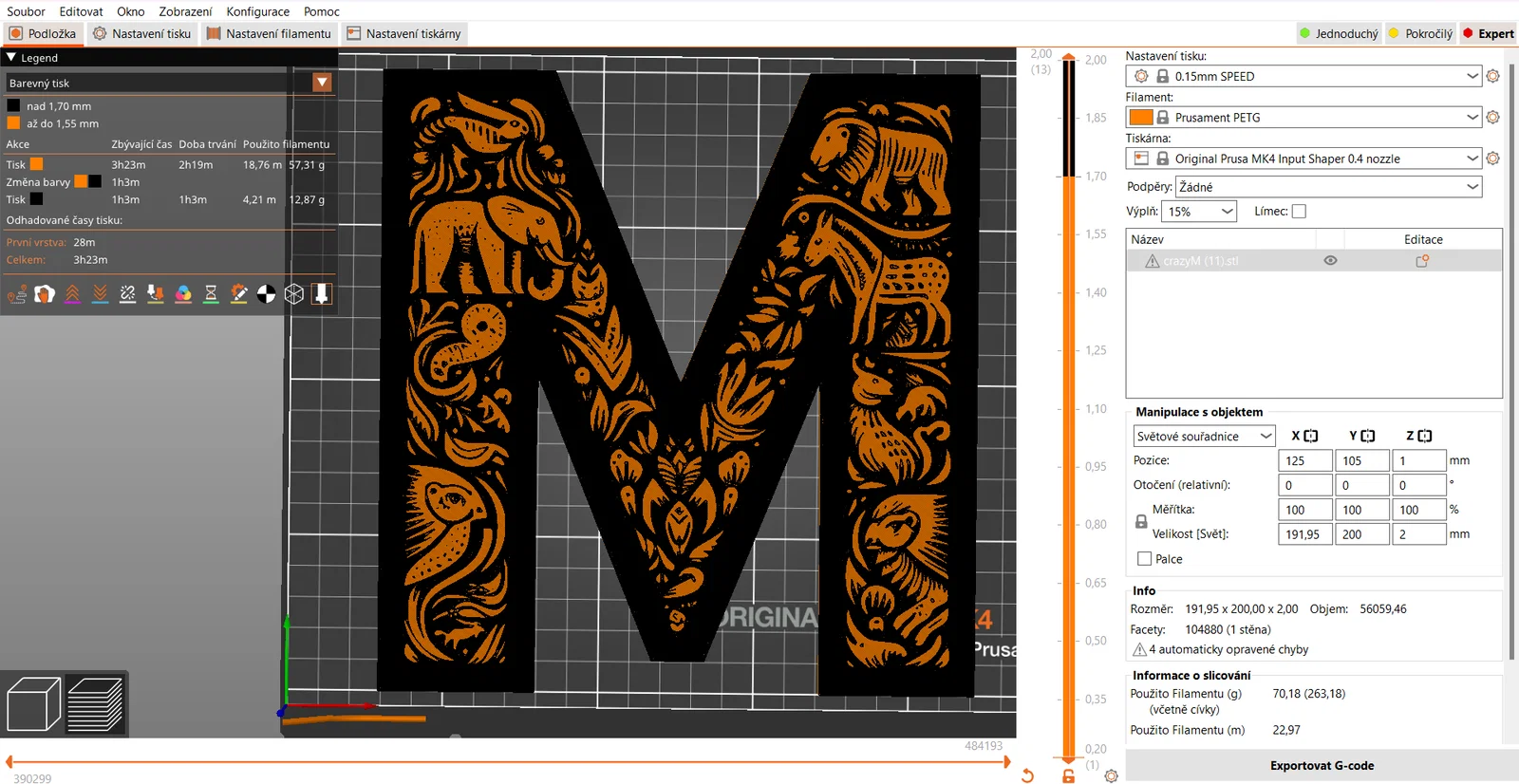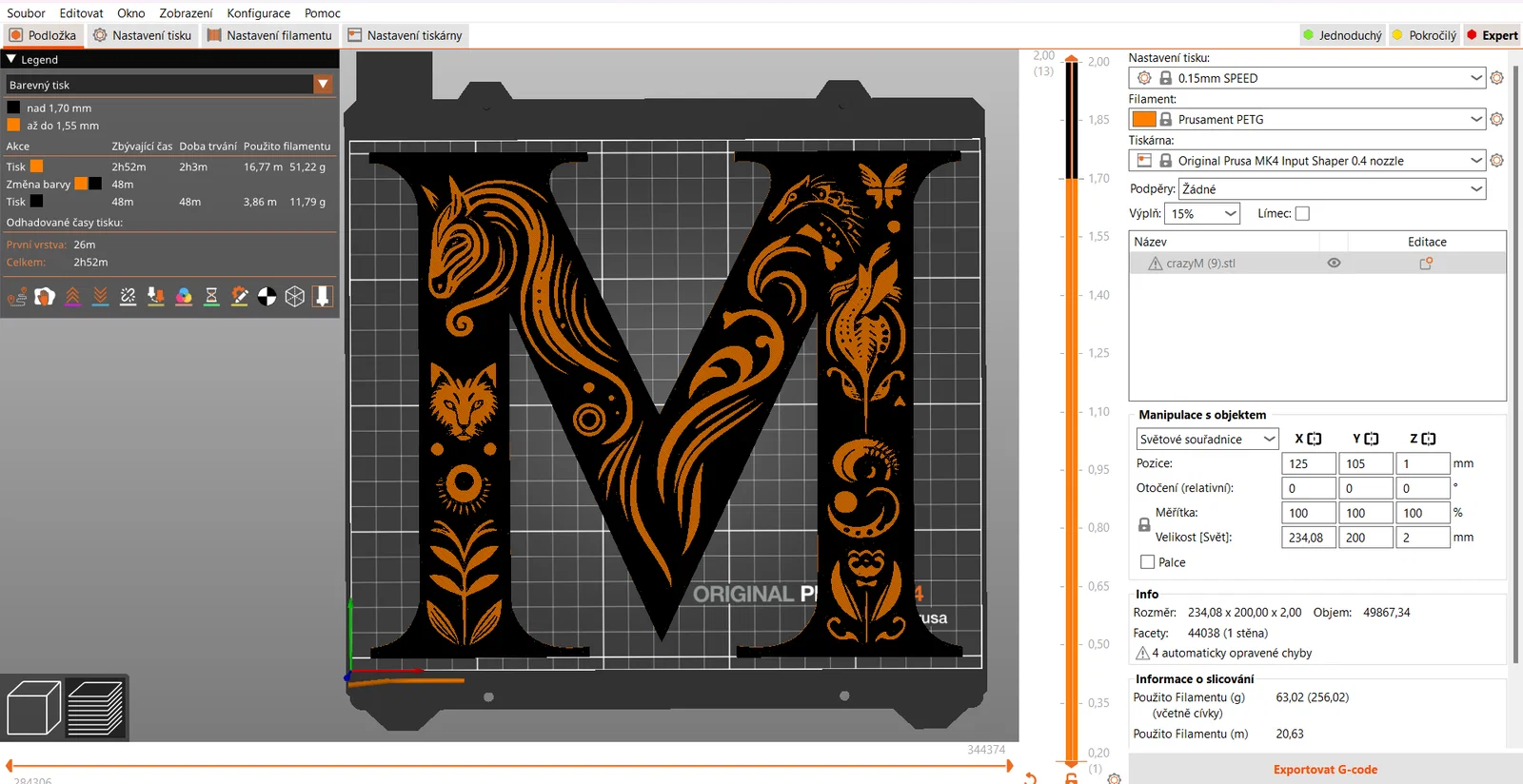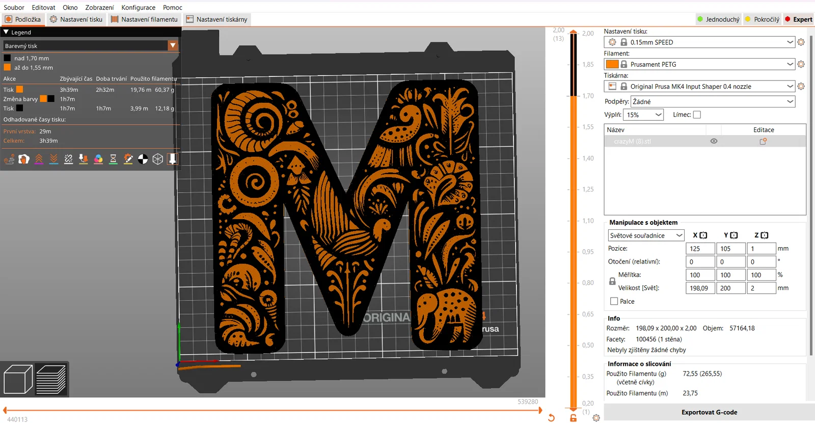 • Chất liệu in: Nên ưu tiên sử dụng nhựa PLA để đảm bảo độ chi tiết cao và ít bị co ngót, giúp các họa tiết nhỏ trên chữ M được giữ nguyên vẹn.