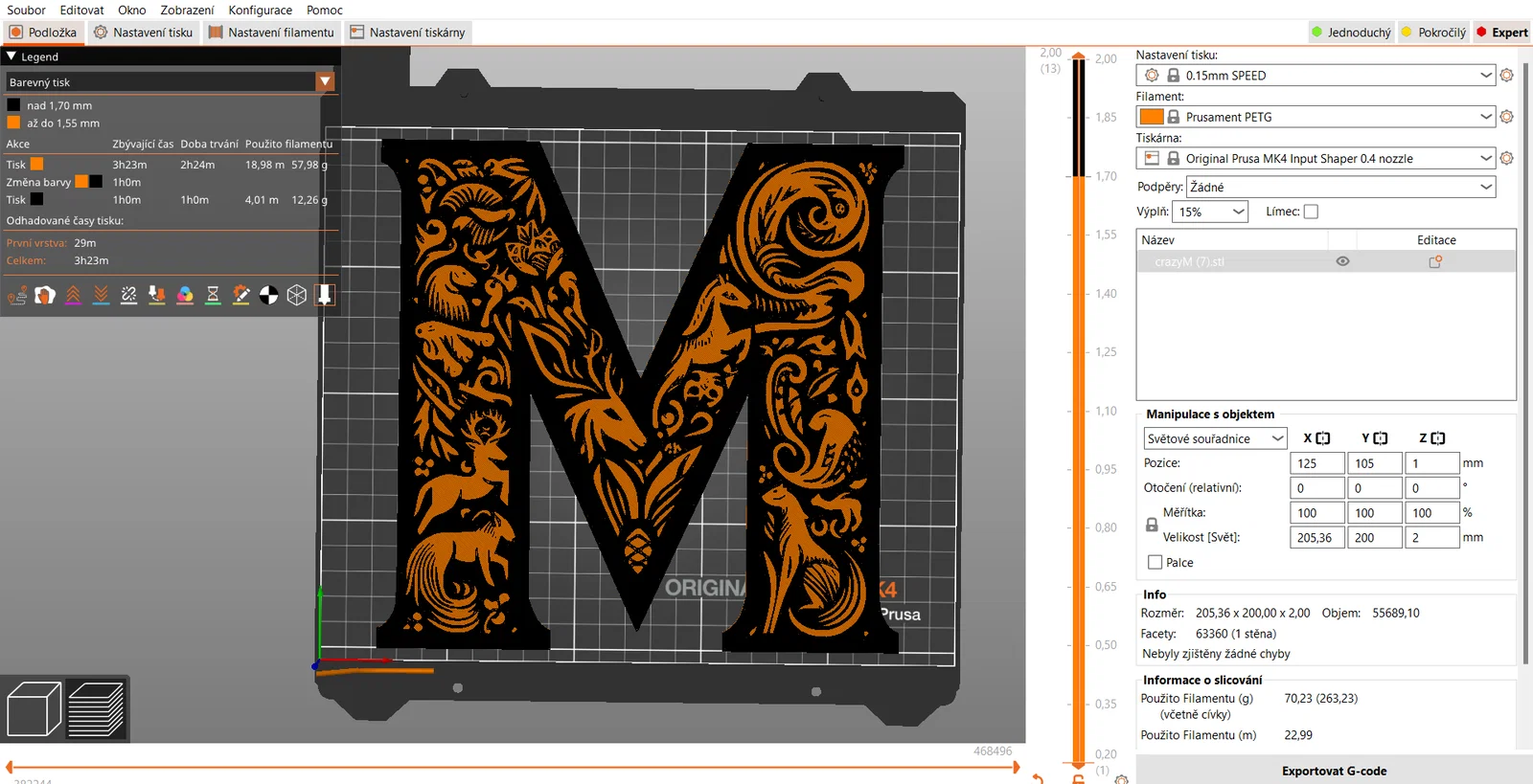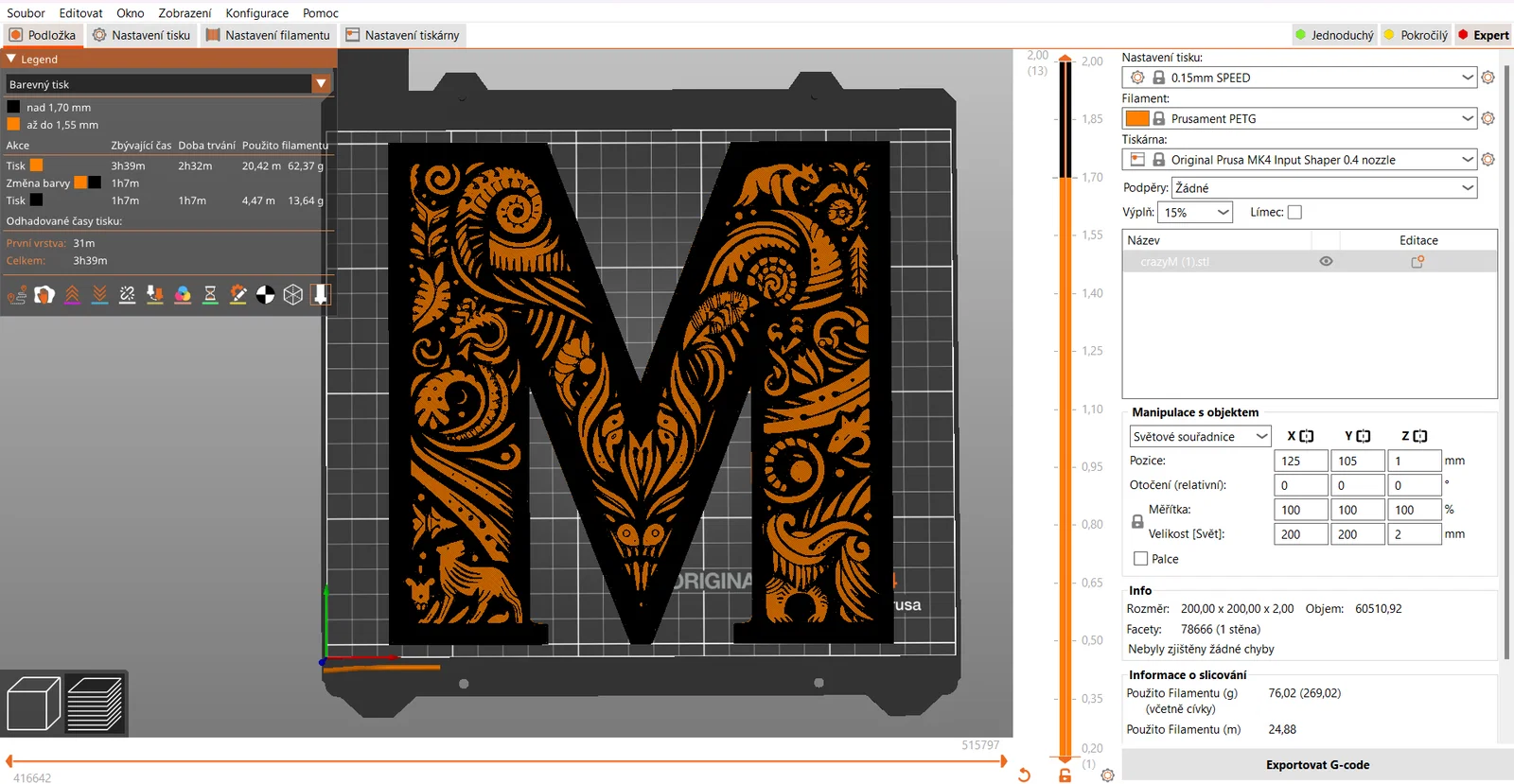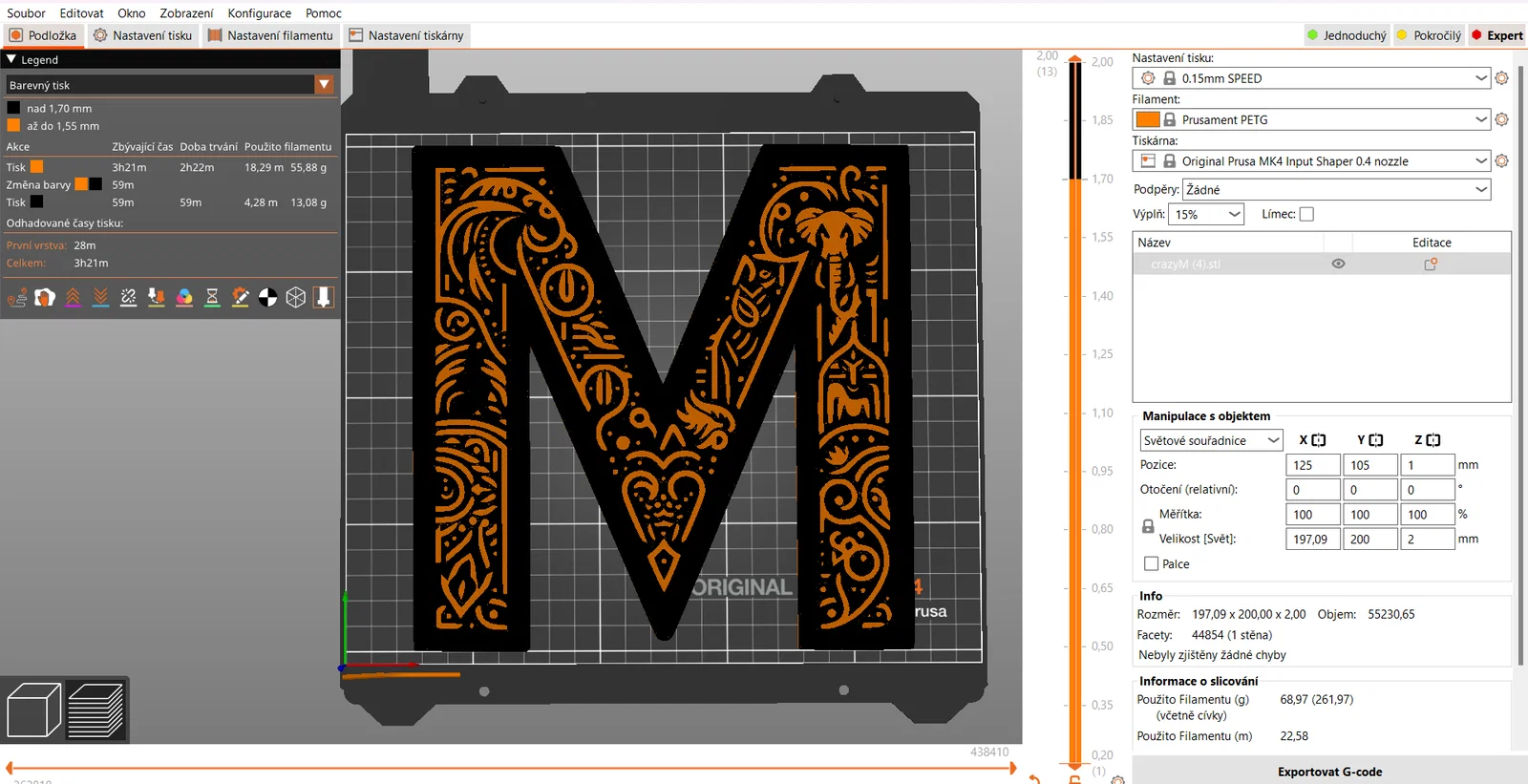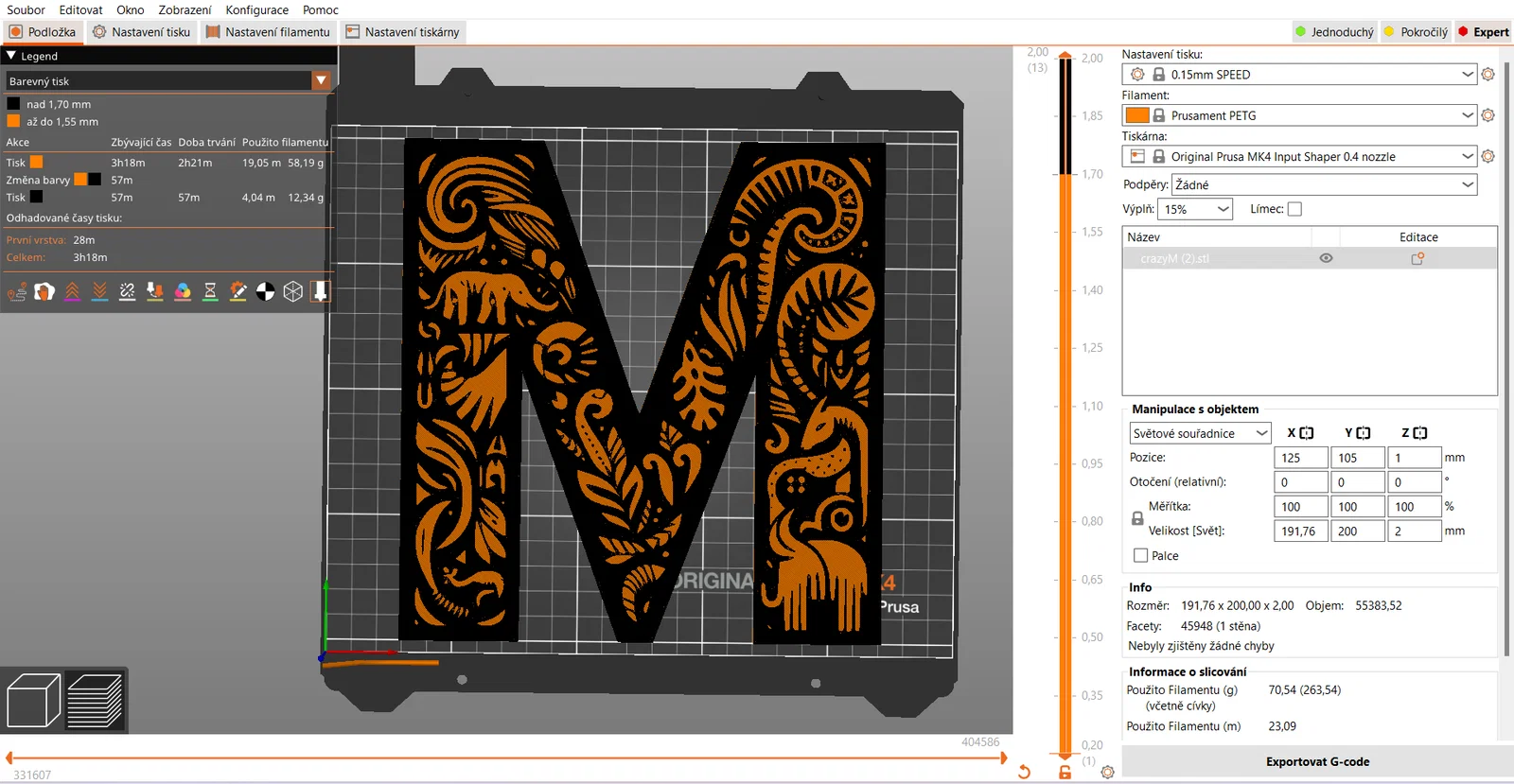 • Chất liệu in: Nên ưu tiên sử dụng nhựa PLA để đảm bảo độ chi tiết cao và ít bị co ngót, giúp các họa tiết nhỏ trên chữ M được giữ nguyên vẹn.