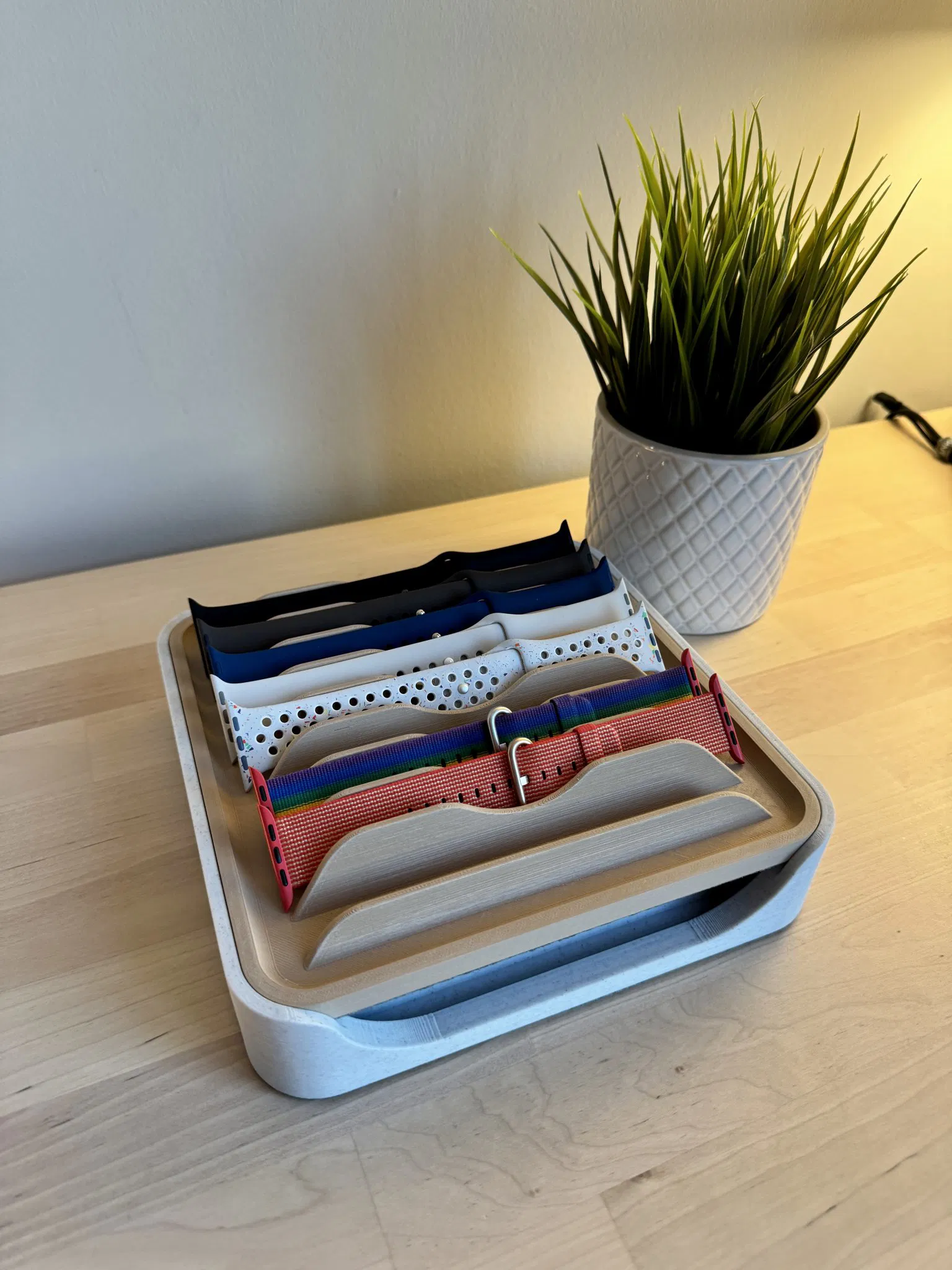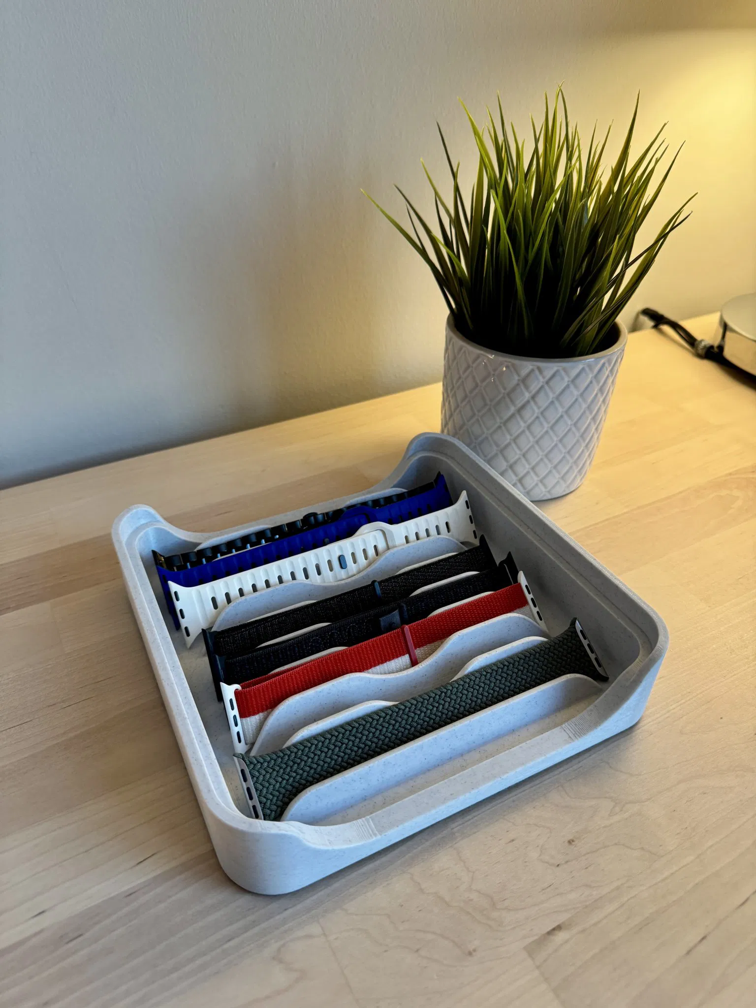 Cập nhật: Hãy xem phiên bản mới và cải tiến của tôi . Tôi đã thiết kế hộp trưng bày này để chứa và trình bày chín dây đeo Apple Watch cùng một lúc. Nó được thiết kế để phù hợp với hầu hết các loại và chiều dài dây đeo, mặc dù có nhiều dây đeo chính hãng và bên thứ ba mà cái này không được thử nghiệm. Tôi cũng đã lót đáy của bản in bằng vải nỉ để mang lại cảm giác cao cấp hơn một chút. Chúc bạn in ấn vui vẻ!