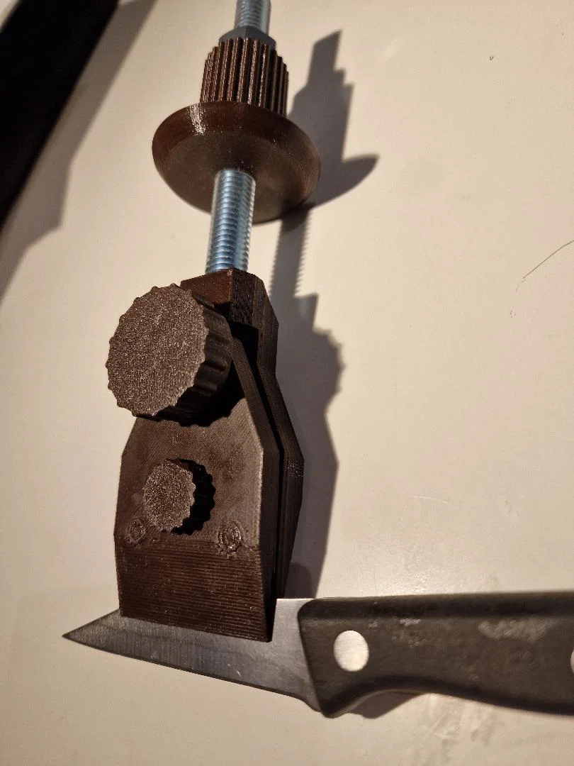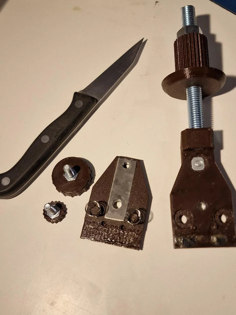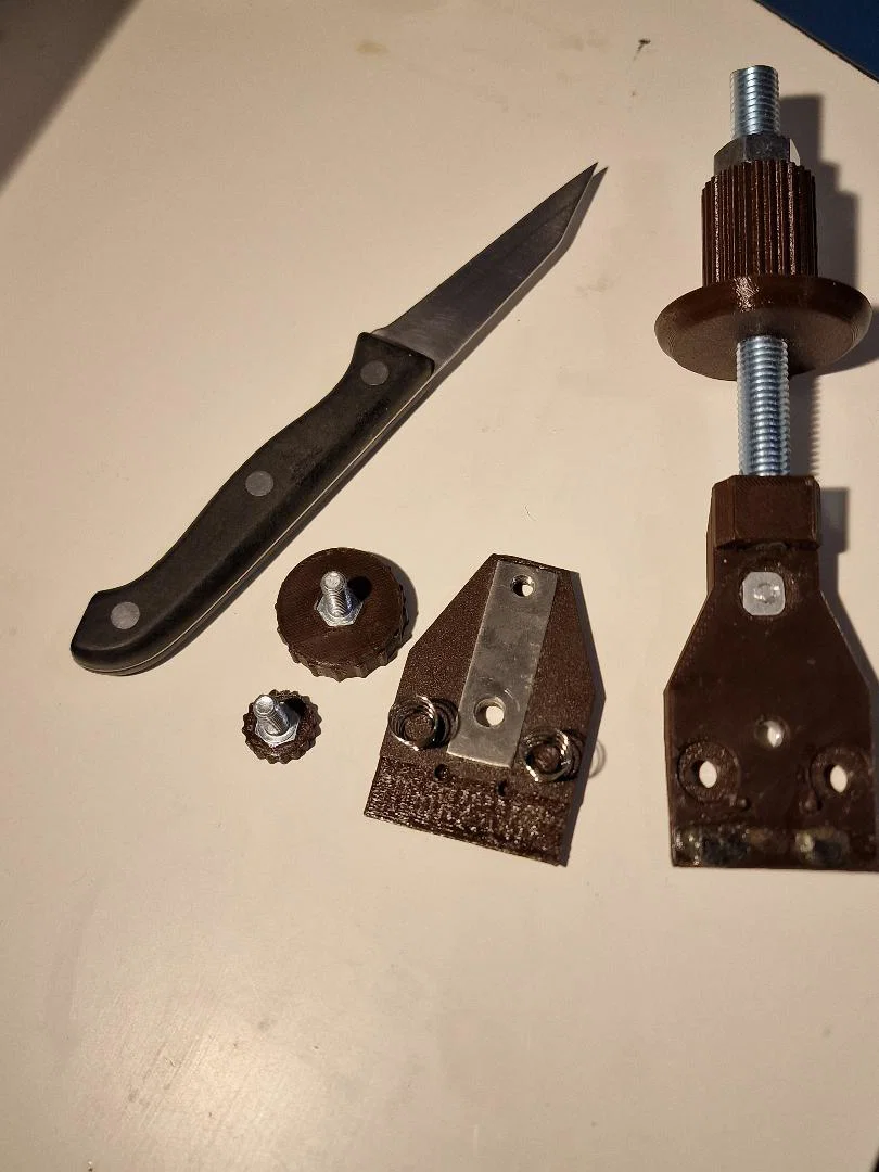 JIG Tormek lấy cảm hứng từ SV 45, giữ được khả năng chỉnh chiều dài/khoảng cách để set góc mài ổn định cho nhiều dao. In PETG 0.2mm, cần ty ren M12, ê-cu/bu-lông M6 và vài phụ kiện kèm theo.