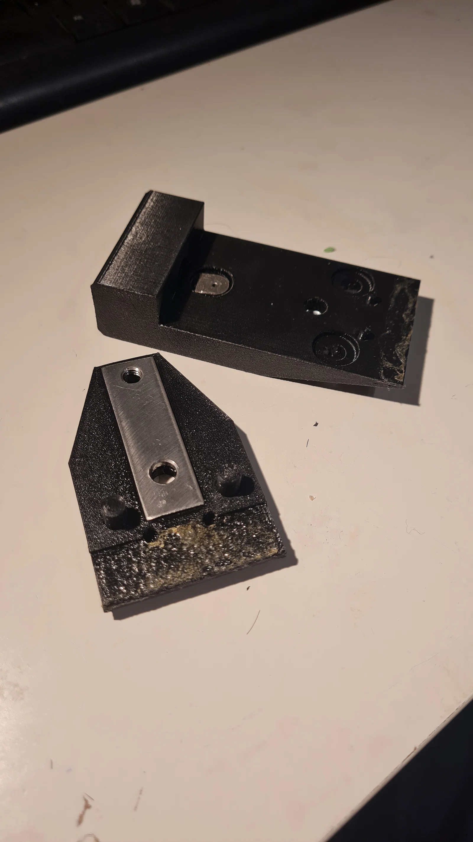 • phần khó hơn: một miếng kim loại (mình may mắn kiếm được inox 49 x 15 x 3 mm, có 2 lỗ khoan: một lỗ taro M6, một lỗ đường kính 6.5–6.7 mm, khoảng cách tâm hai lỗ 33 mm). Miếng này là phần tỳ giúp kẹp lưỡi an toàn hơn, nhưng mình nghĩ nếu không có thì JIG vẫn có thể đủ cứng để đảm bảo lưỡi không bị xê dịch khi mài.