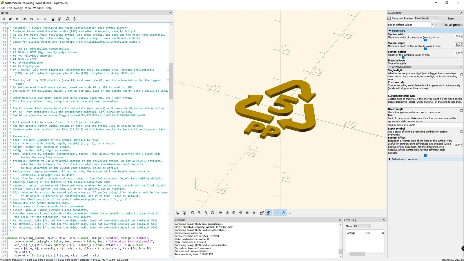 Bộ công cụ Recymbol giúp tạo và tùy biến ký hiệu tái chế (STL + OpenSCAD customizer/library). Hỗ trợ offset/clearance, stack để đổi màu theo Z, và mẹo “print on print” trong PrusaSlicer để in nhiều màu không cần MMU.