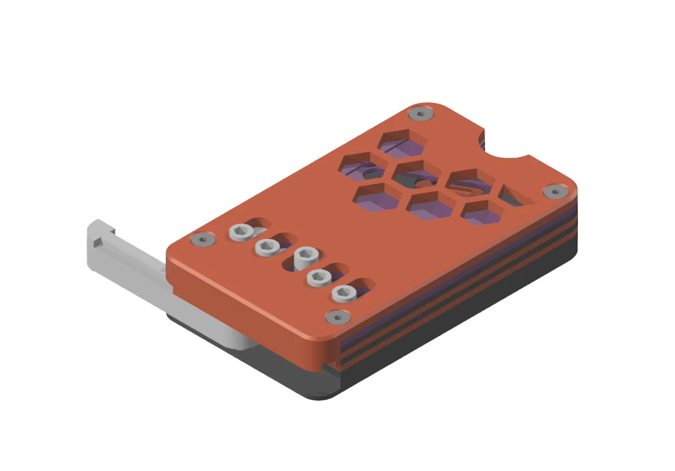 Mẫu ví in 3D có 5 khe thẻ, dùng lò xo in sẵn và cần gạt để đẩy thẻ ra 3–4 mm cho dễ rút. Mặt sau có ngăn đựng tiền với cửa trượt. Kích thước 110x85x26 mm, cần vít M5x25 và đai ốc M5.