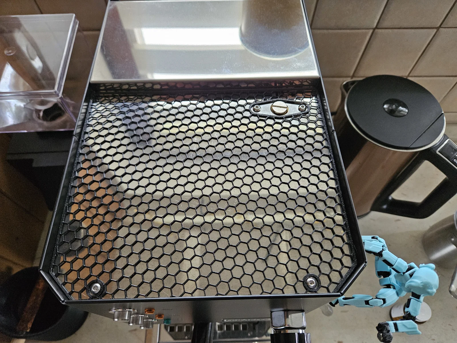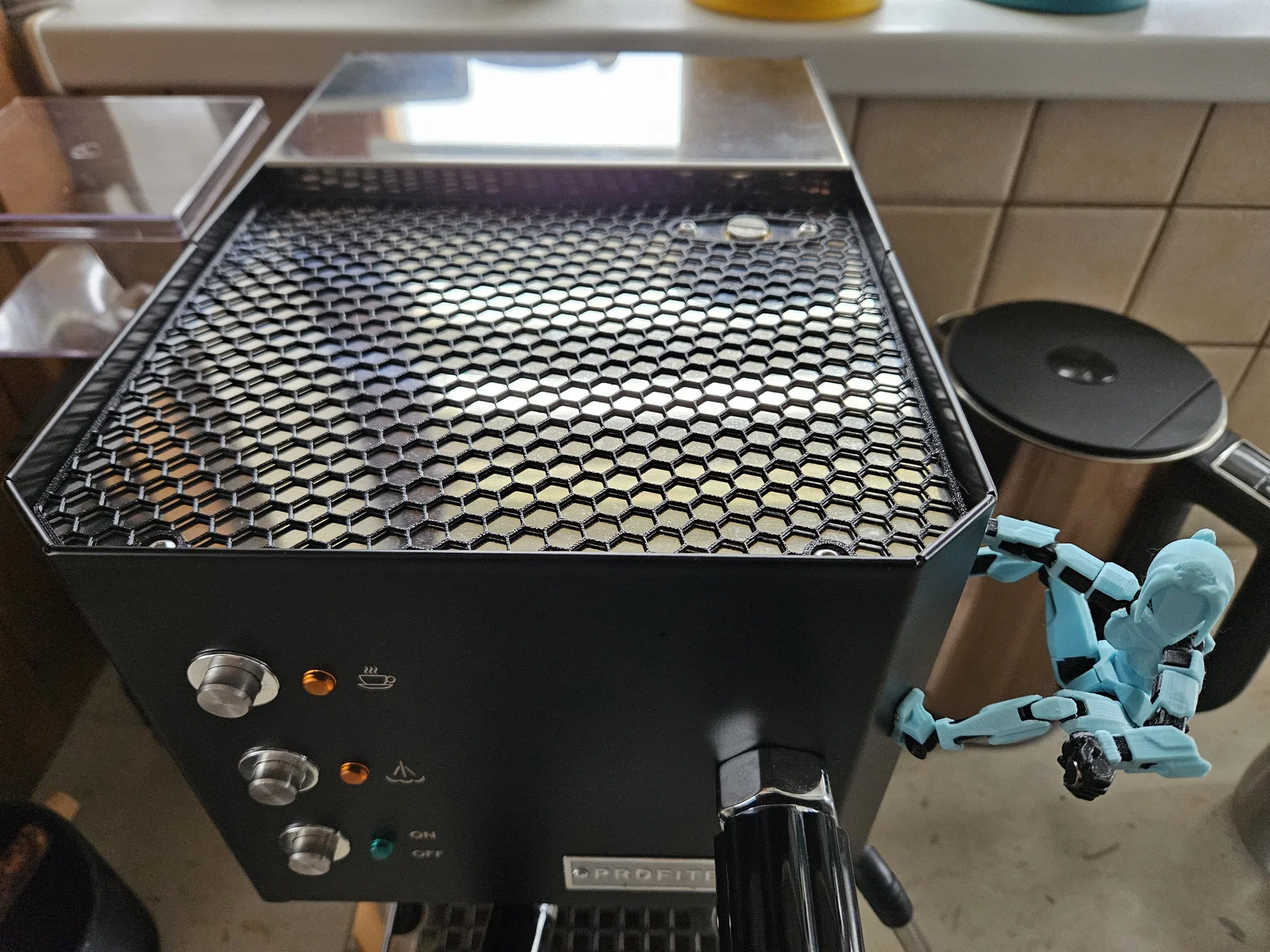 Miếng lót chống trầy đơn giản cho máy pha cà phê Profitec GO. Gợi ý in: layer 0,2 mm, 3 walls, không bottom/top, infill honeycomb 10%. Có nhắc thêm mẫu nắp bình nước cửa trượt giúp giảm lạch cạch.