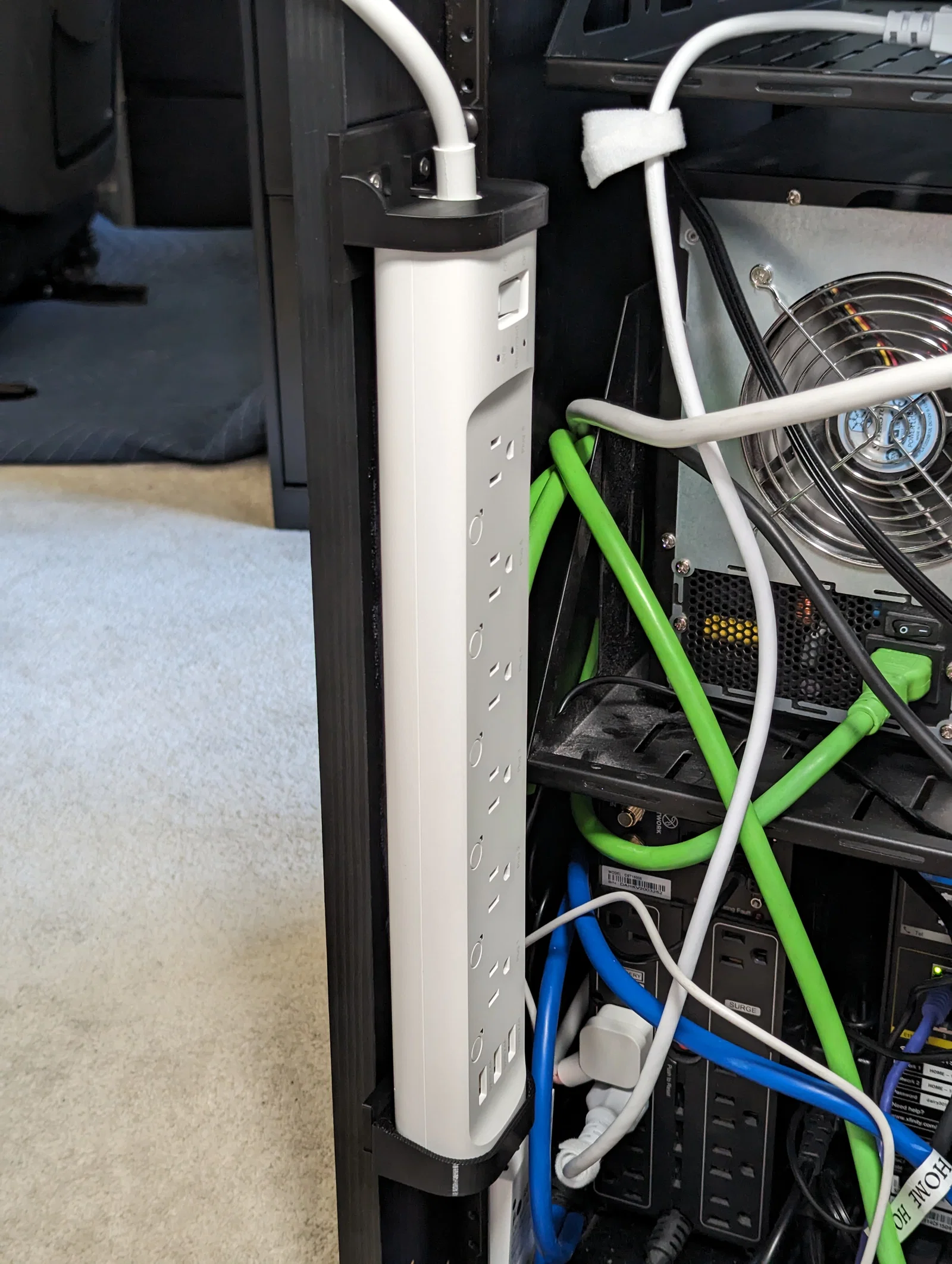 Bracket rack mount dạng L để gắn dọc power strip Kasa HS300, tận dụng lại end caps có sẵn. Có kèm end caps m3f đã chỉnh và link remix để tránh lỗi fitment ở khu vực strain relief. Dùng M3x6 nuts + countersunk screws.