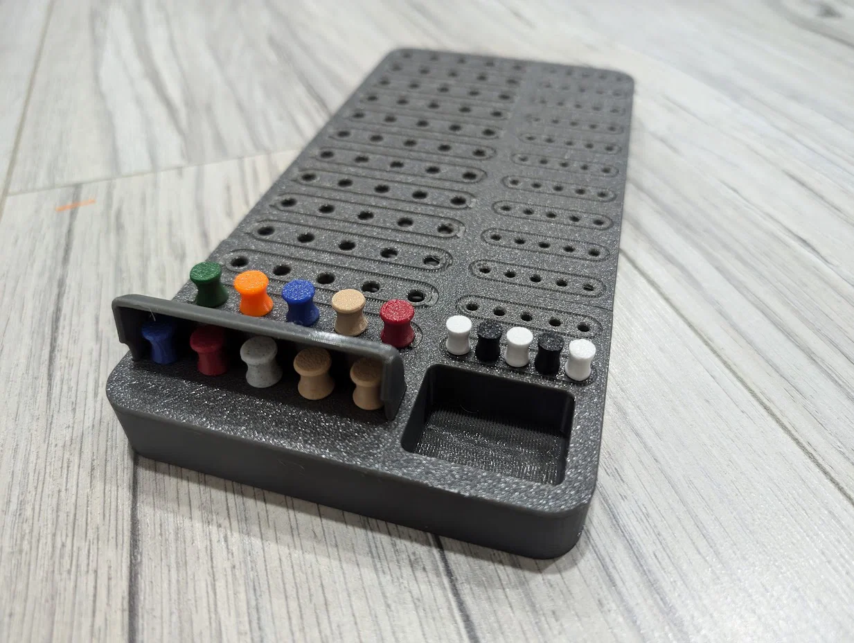 Thiết kế game Mastermind kèm các quân chơi và một nắp để che các chốt.