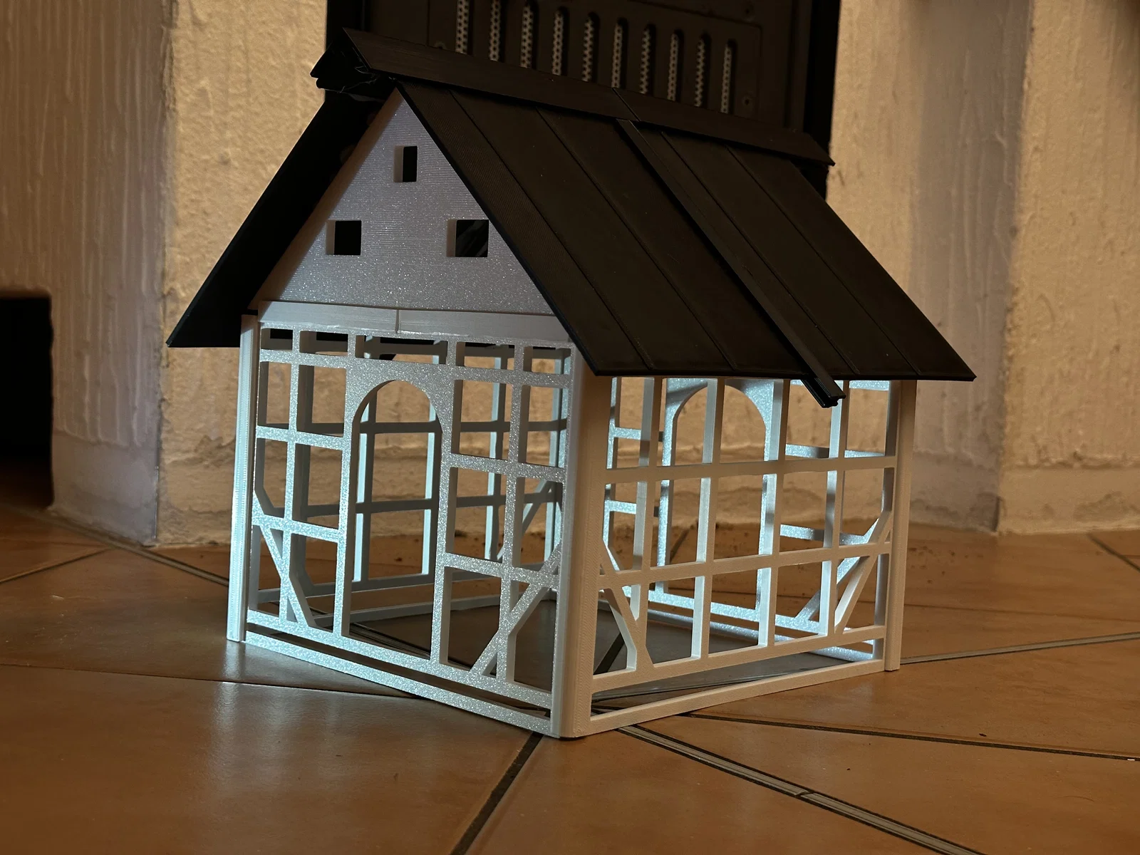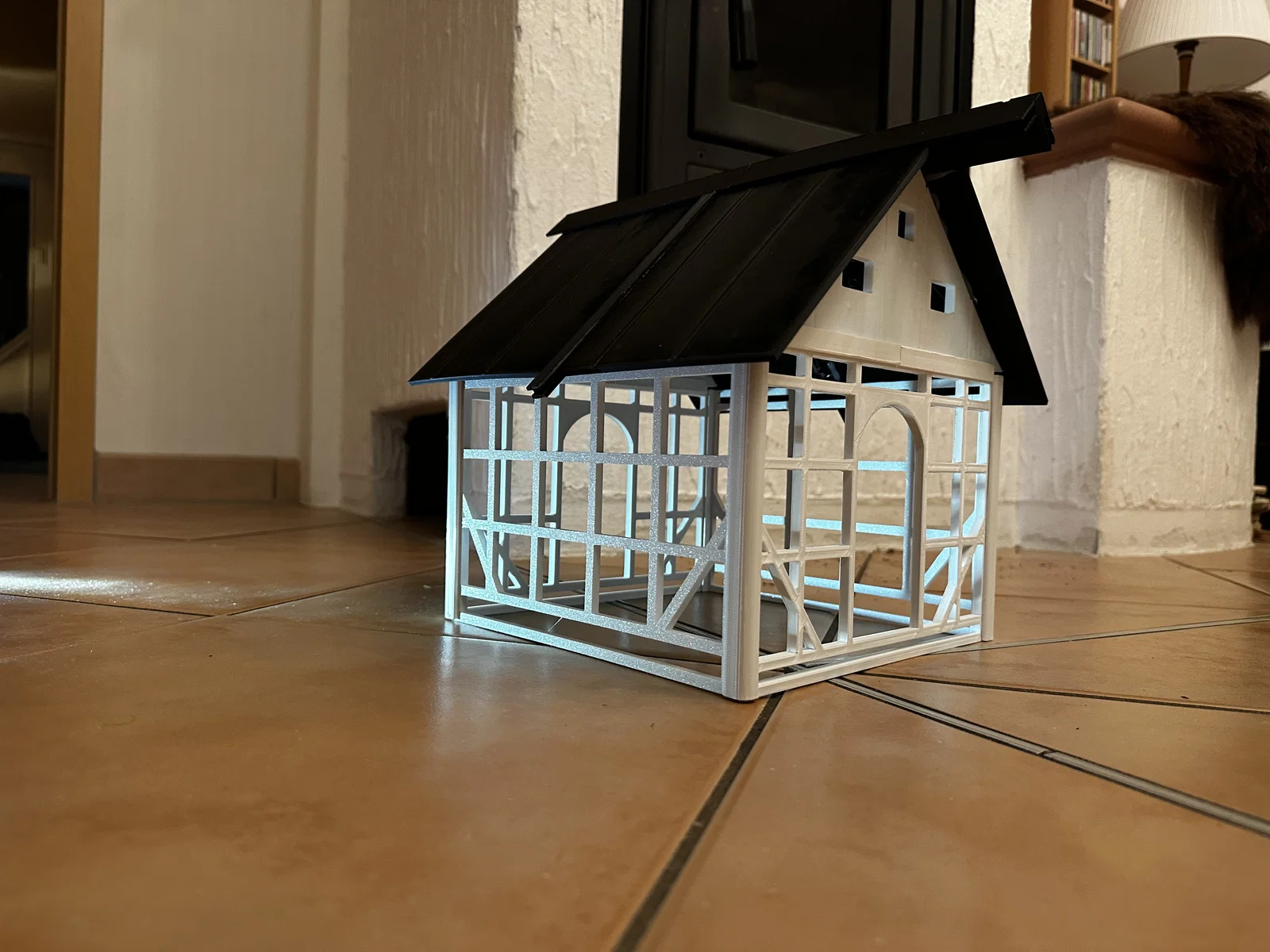 Mẫu nhà cho chim/khay cho chim ăn kiểu Fachwerk Schleswig-Holstein, lắp cắm ghép thân và mái. Kích thước 23×23 cm, cao 27 cm, in PLA trên Anycubic Kobra 2 Pro; gồm nhiều phần tấm mái, đầu hồi và khớp nối.